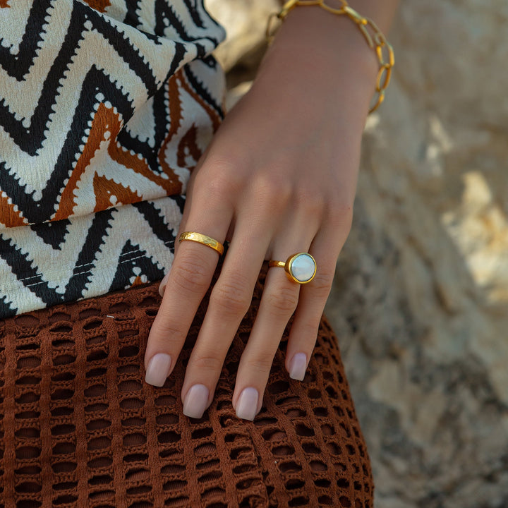 This Textured Brilliance Hammered Gold Band Ring by Mejoma is a stunning and unique statement piece that adds character and sophistication to any look. The hammered gold band has a beautifully unique texture that catches the light and adds a touch of handcrafted artistry. This ring is a timeless accessory that celebrates individuality and can be worn for any occasion, ready to shine and make a lasting impression.