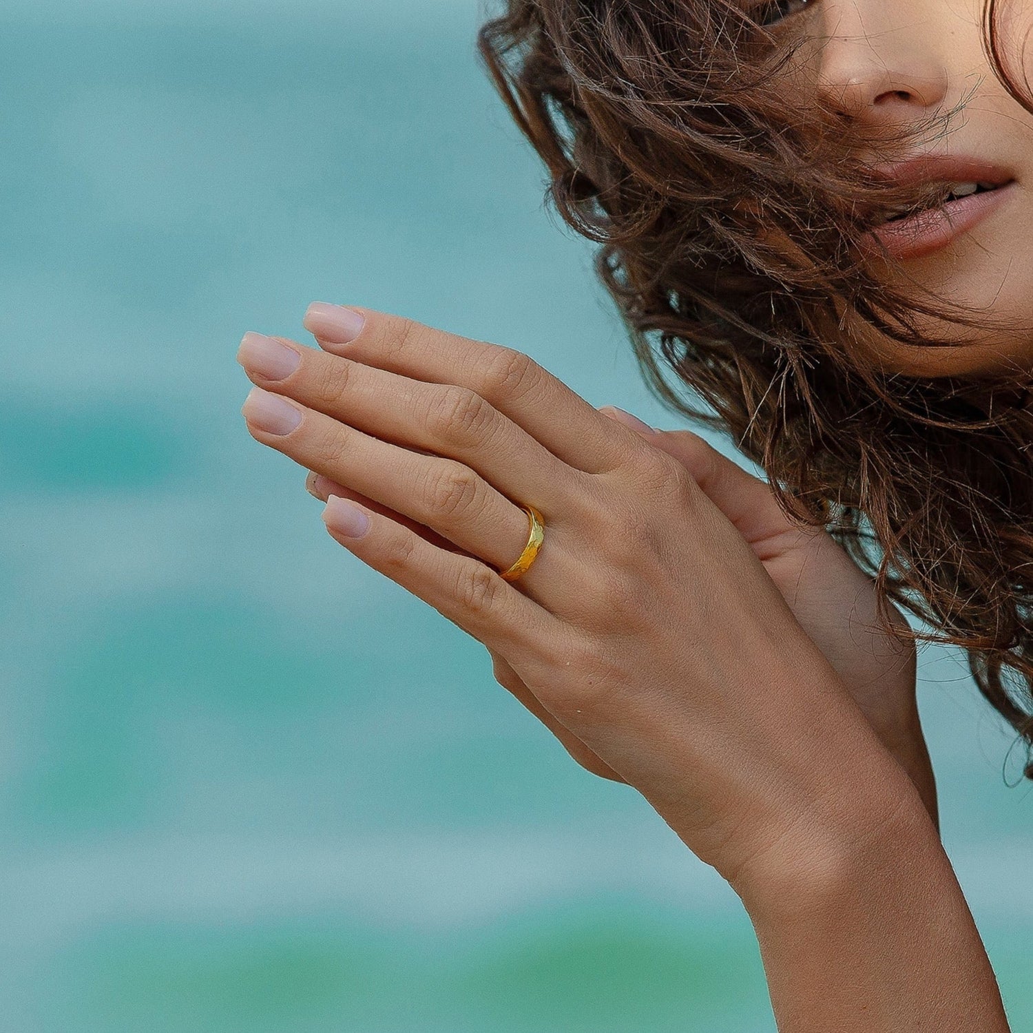 This ring is a handcrafted hammered band crafted from a gold-toned metal.