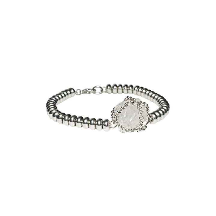 This bracelet is crafted from waterproof stainless steel with a signature caged quartz gemstone centerpiece.