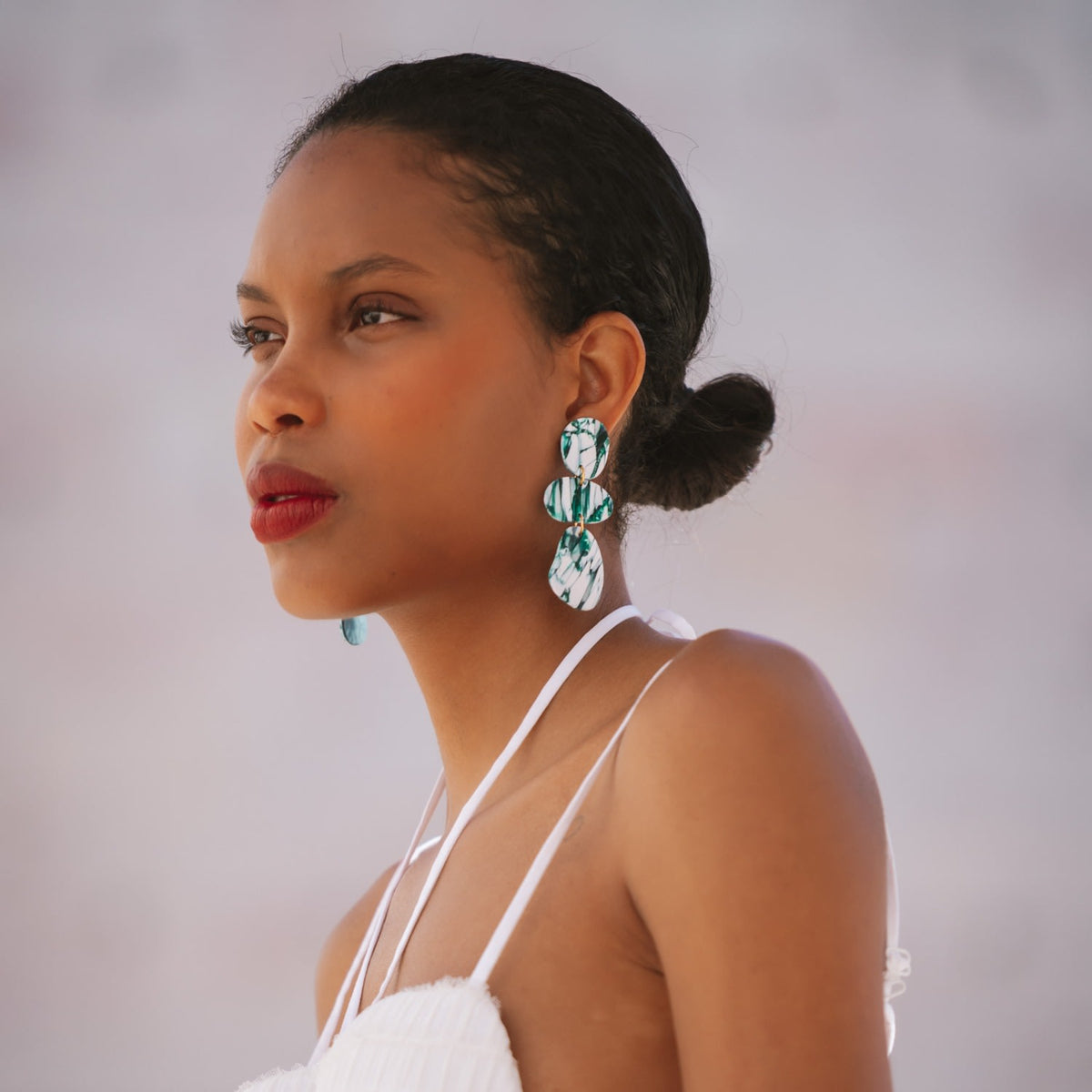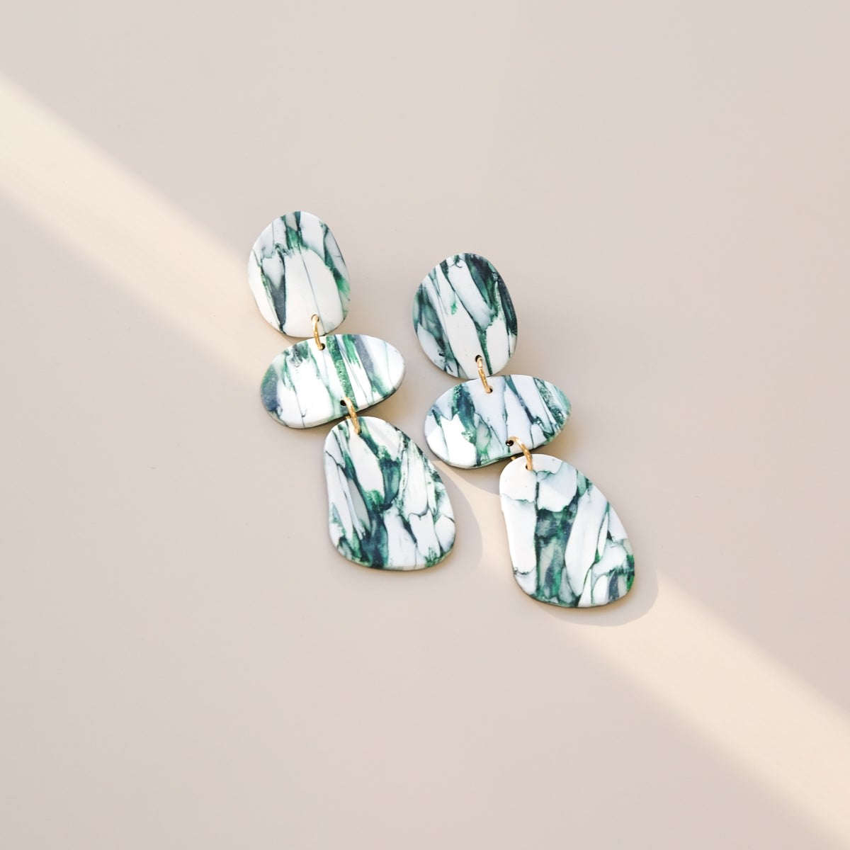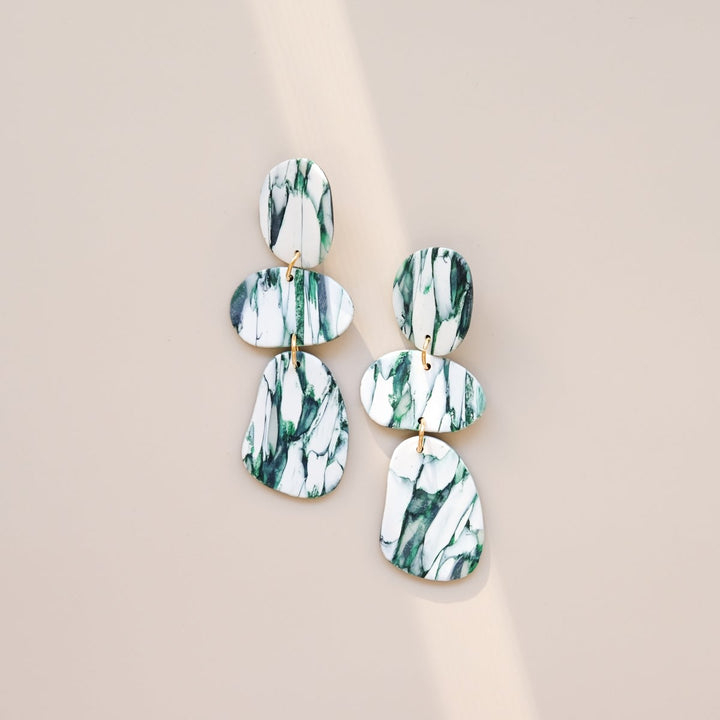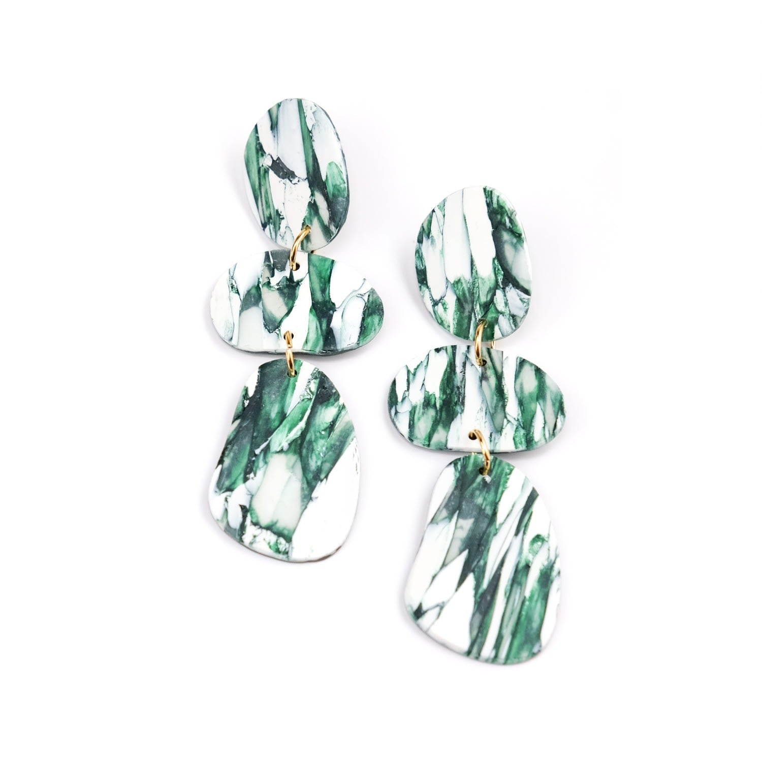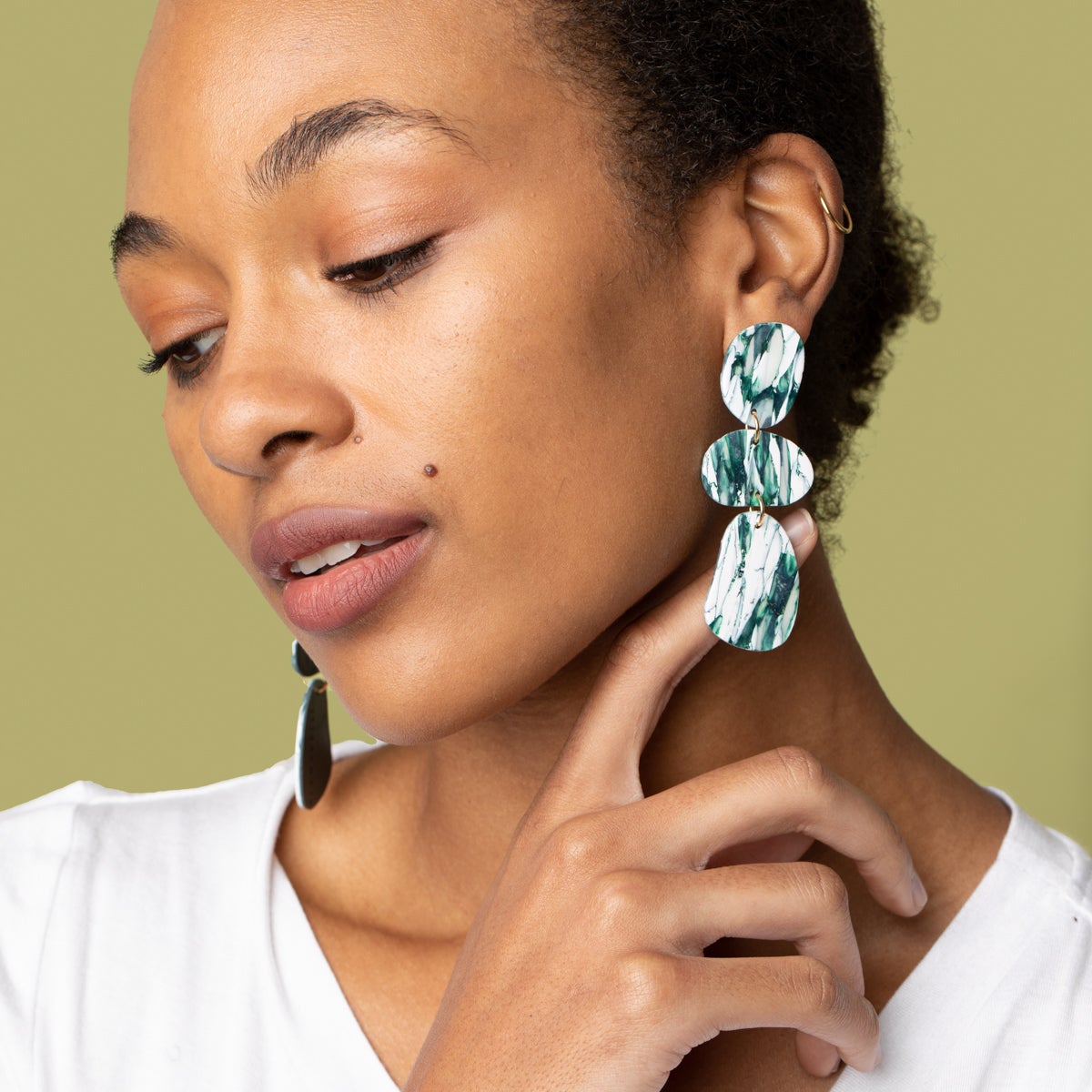 These Celestia Dangly Earrings In Forest Green Marble by By Chavelli are a fun and striking accessory with a touch of elegance. Their organic shapes resemble balancing rocks, creating a sense of movement and sway. Despite their size, the elongated, asymmetrical design brings a calming aesthetic. The neutral marbled pattern makes them delightfully bohemian and versatile, perfect for adding a pop of color to an all-black outfit or complementing a variety of textures.