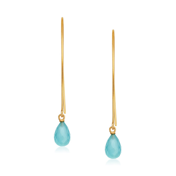 These hoops are handcrafted from 18k gold plated sterling silver, which is nickel-free. They feature Blue Chalcedony drops.