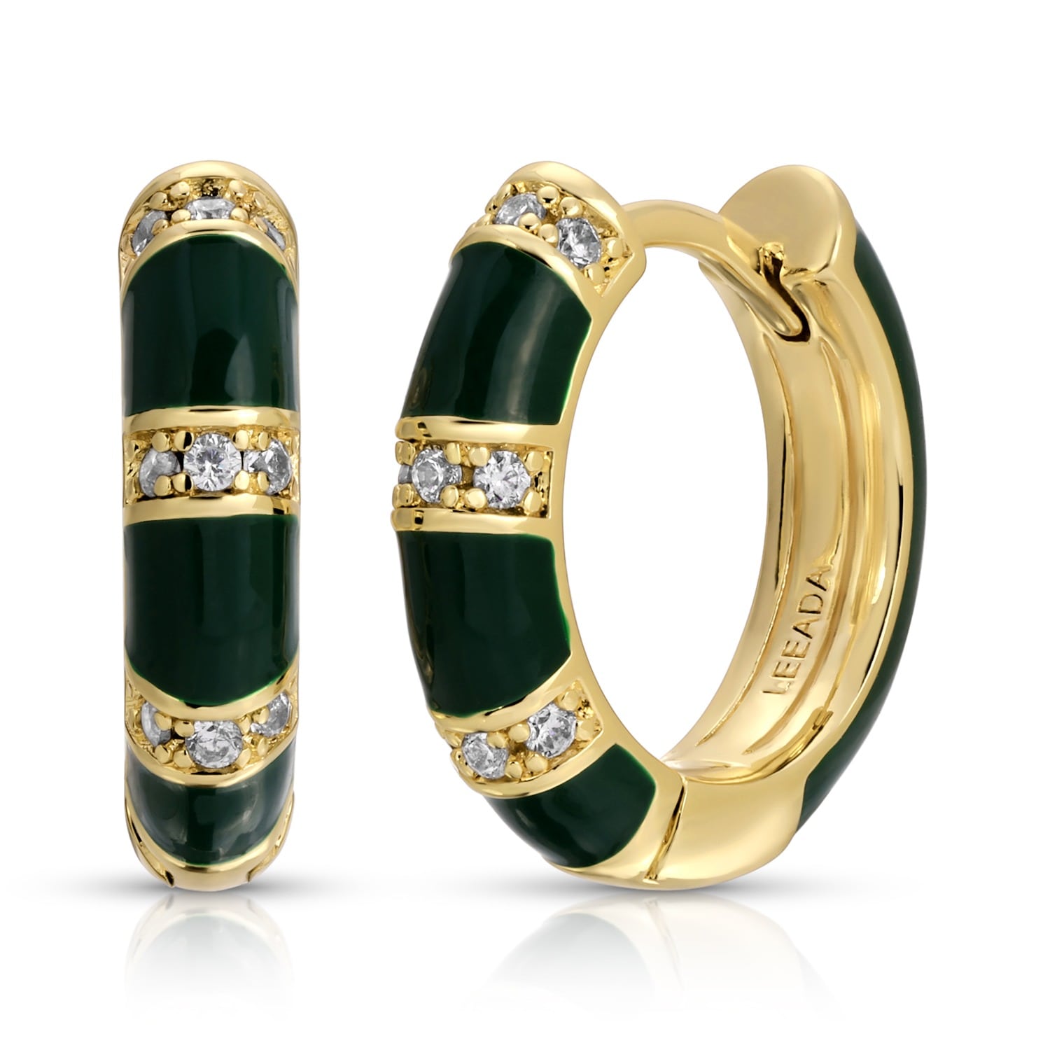 These huggie earrings are made with 14k gold plating over brass. They feature a green enamel overlay with white cubic zirconia accents.