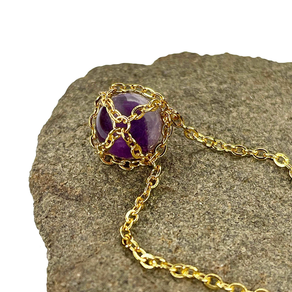 This Caged Golden Brass Caged Amethyst Necklace by Mhart is a captivating and unique accessory. The necklace features a rare amethyst sphere gemstone, which is hand-selected from a mine in North Carolina, ensuring each piece is truly one-of-a-kind. The stone is meticulously caged in a gold chain designed to mimic a spider's web, creating a mesmerizing and artistic look. The amethyst symbolizes love and spirituality, adding a meaningful touch to this beautiful piece.