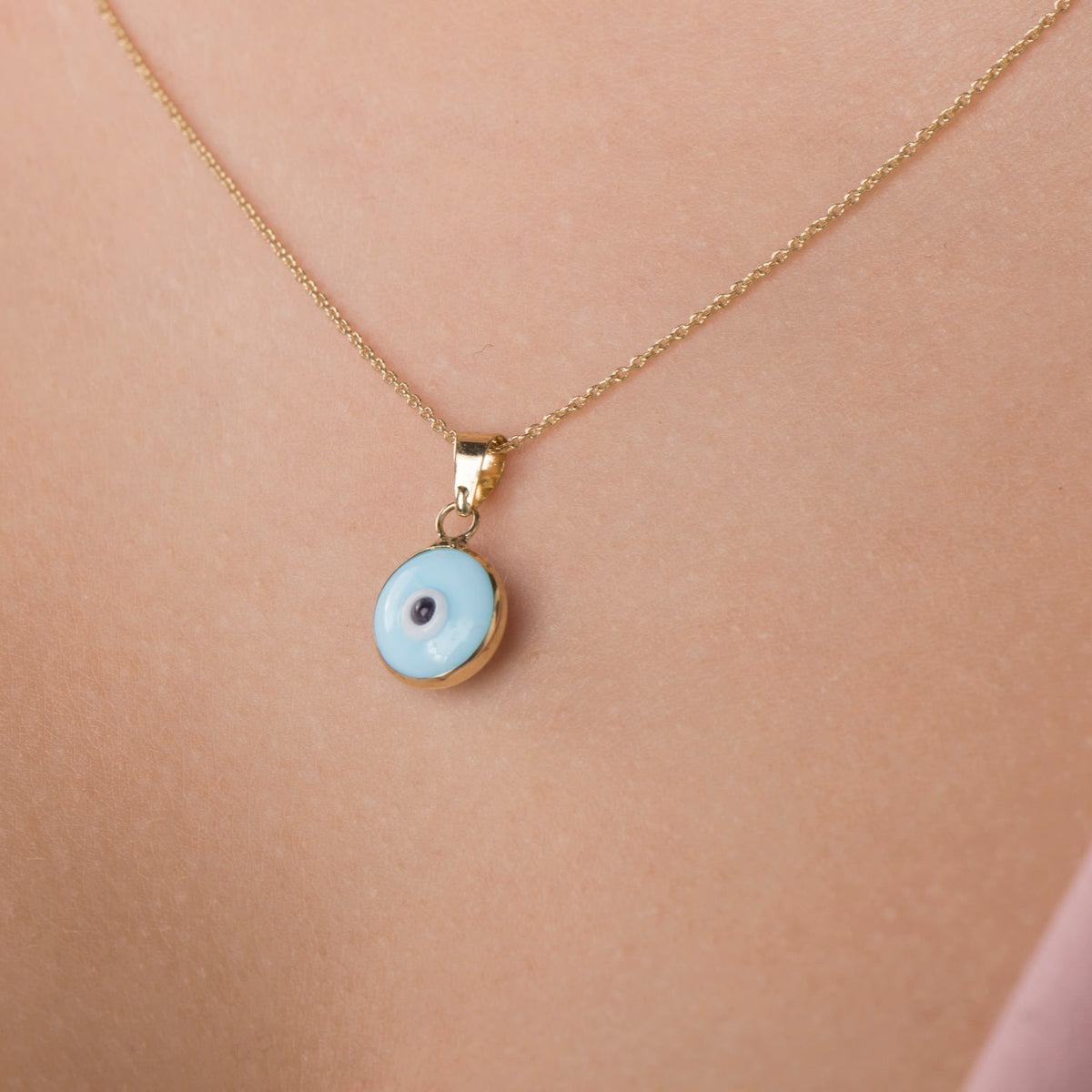 This Baby Blue Evil Eye Pendant by Jewelsty Fine Jewelry is a symbol of good fortune and protection, designed to be a cherished personal talisman. The double-sided evil eye offers continuous safeguarding, while the solid 14k gold craftsmanship ensures its beauty and durability will last a lifetime. This pendant marries deep-rooted symbolism with luxurious design, creating a piece that is both profoundly meaningful and elegantly stylish. It represents a a blend of spiritual protection and timeless luxury.