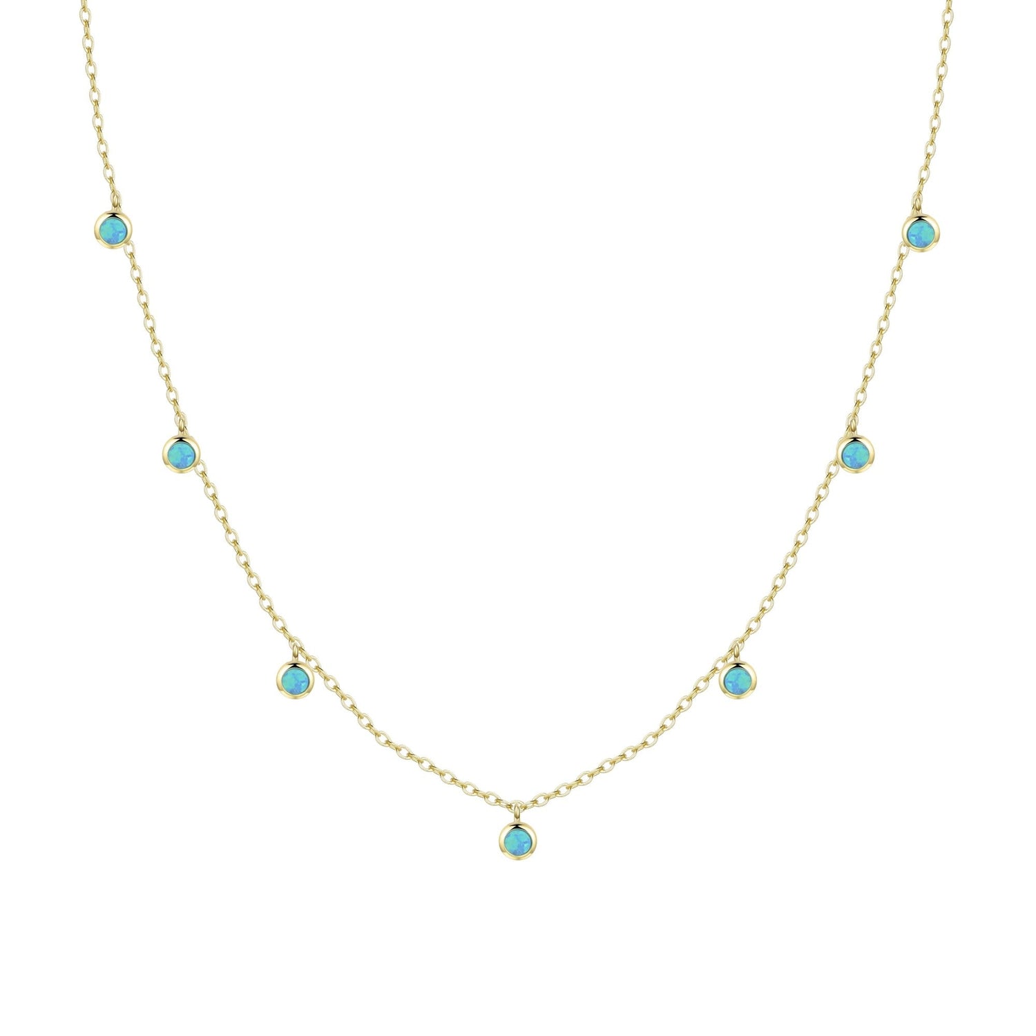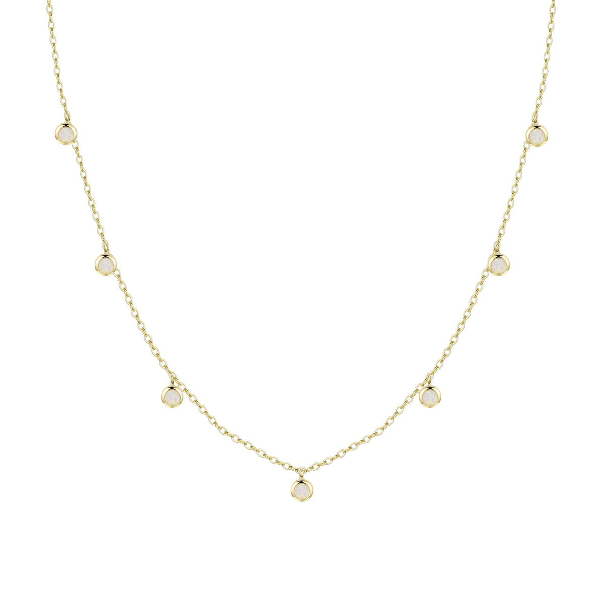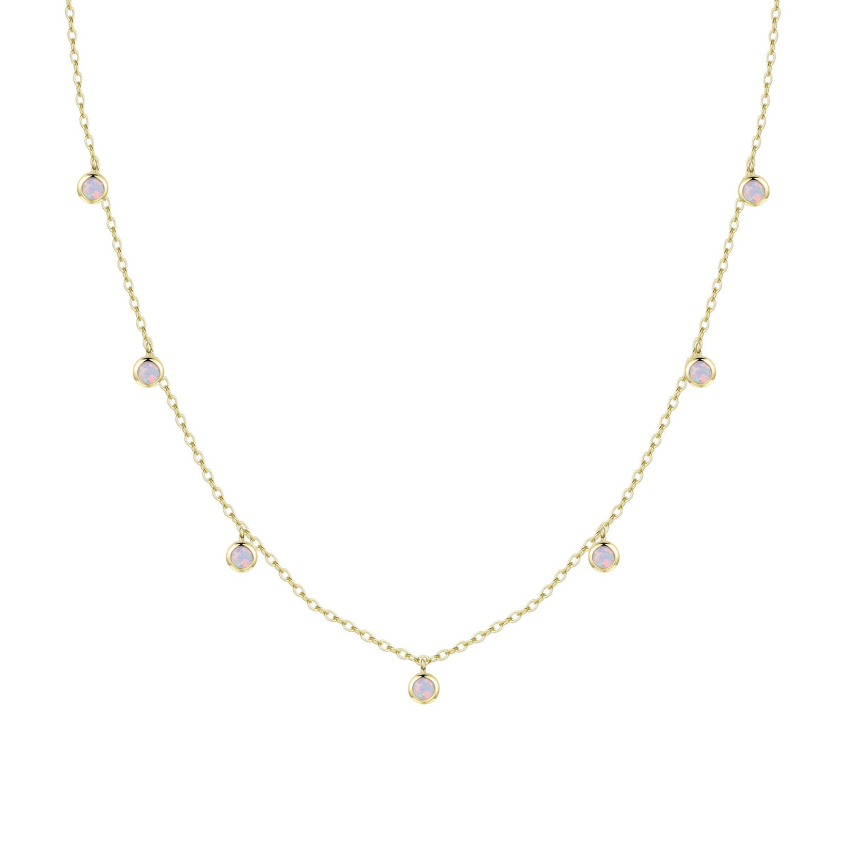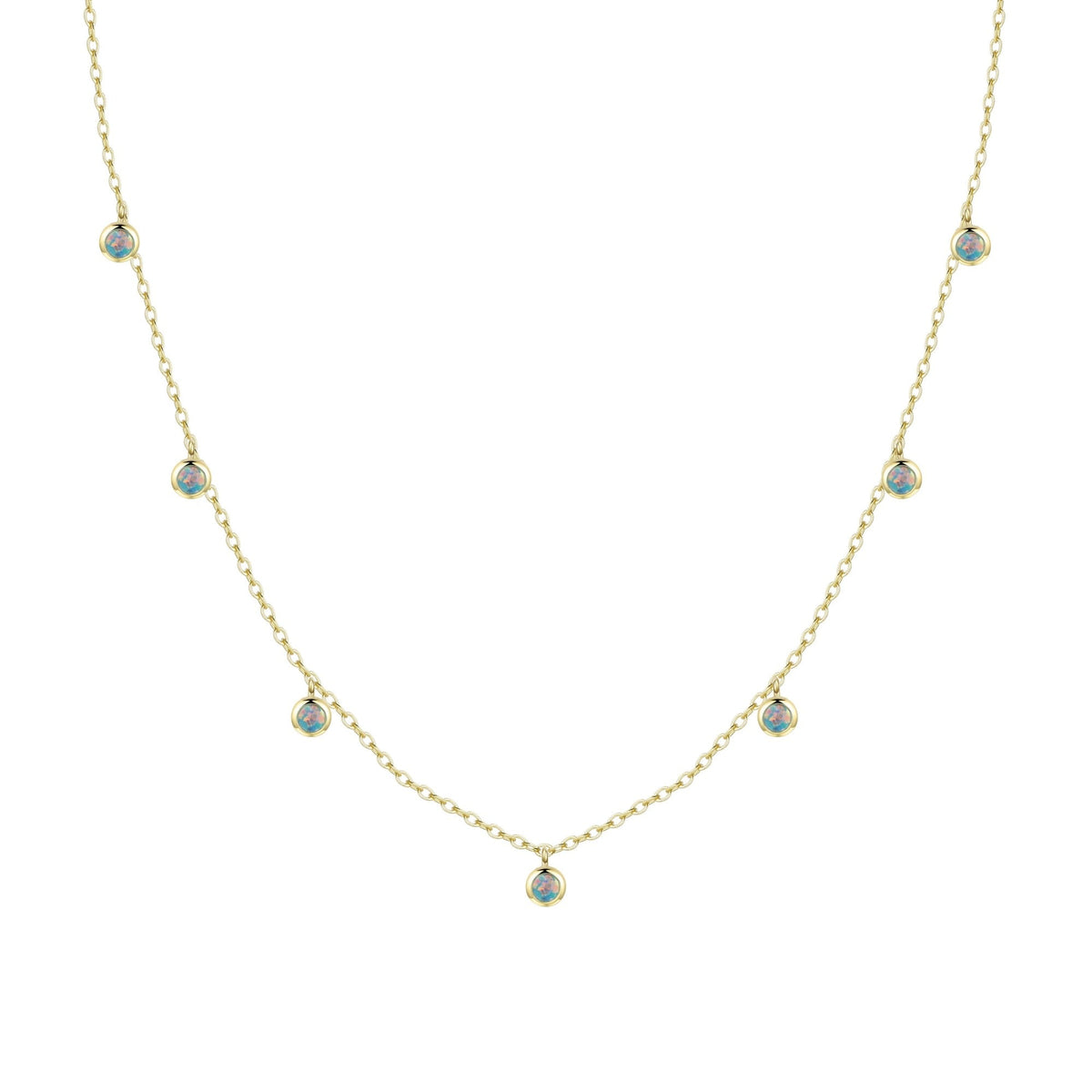 This layering necklace is made of sterling silver with 14k gold plating. It features high-quality lab-created opals and has an adjustable chain up to 18 inches.