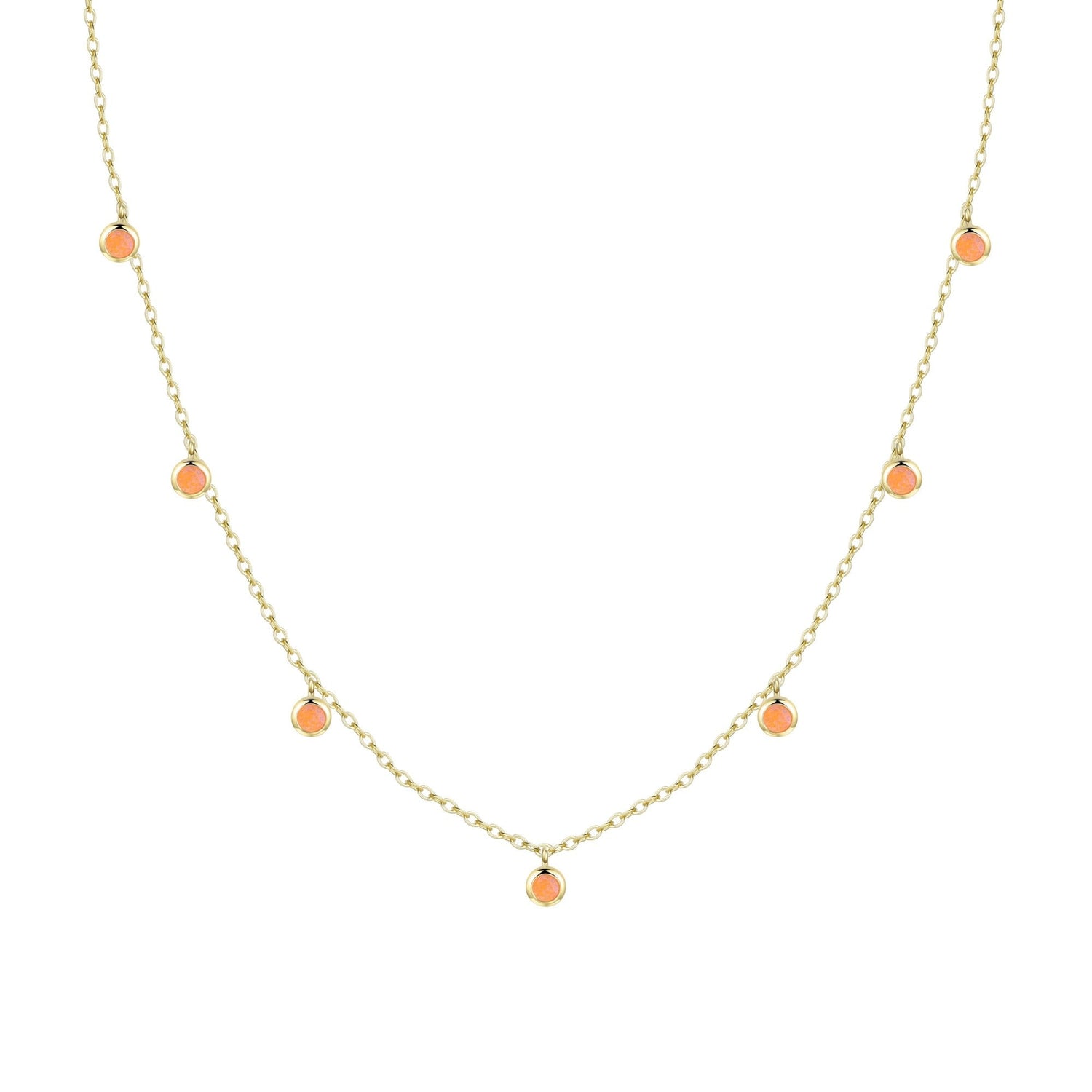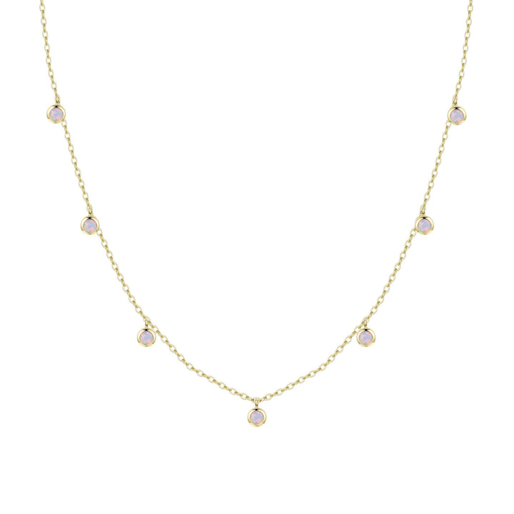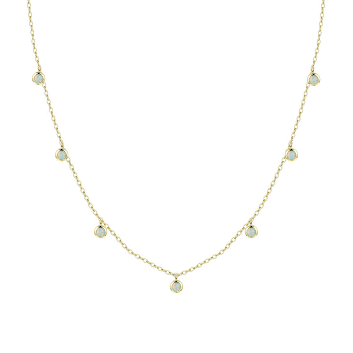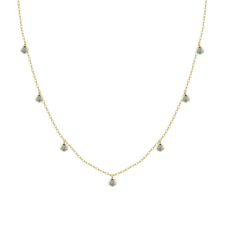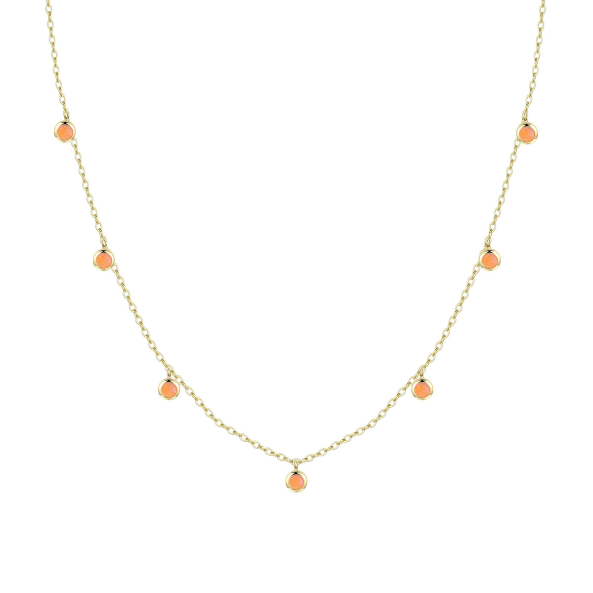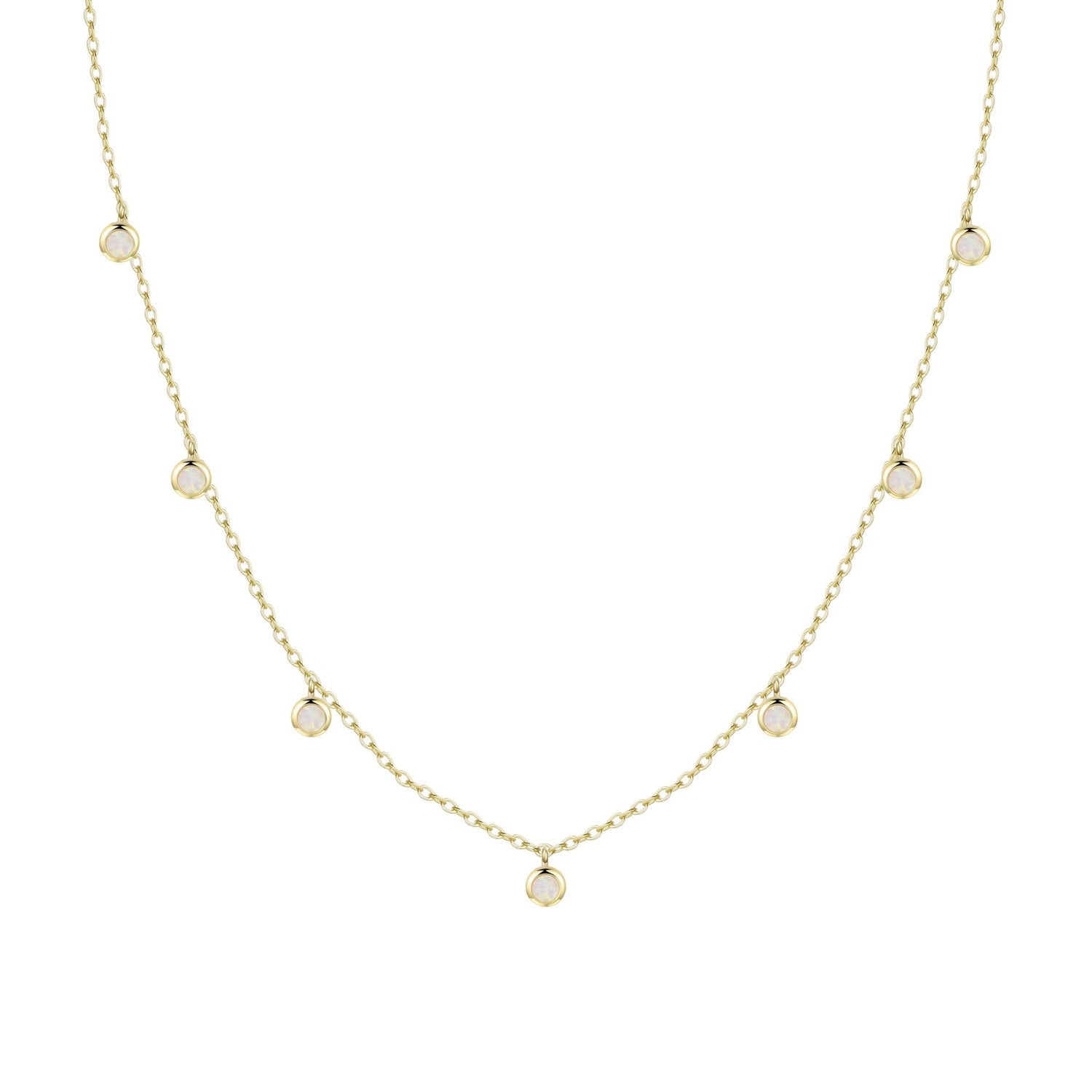 This layering necklace is made of sterling silver with 14k gold plating. It features high-quality lab-created opals and has an adjustable chain up to 18 inches.