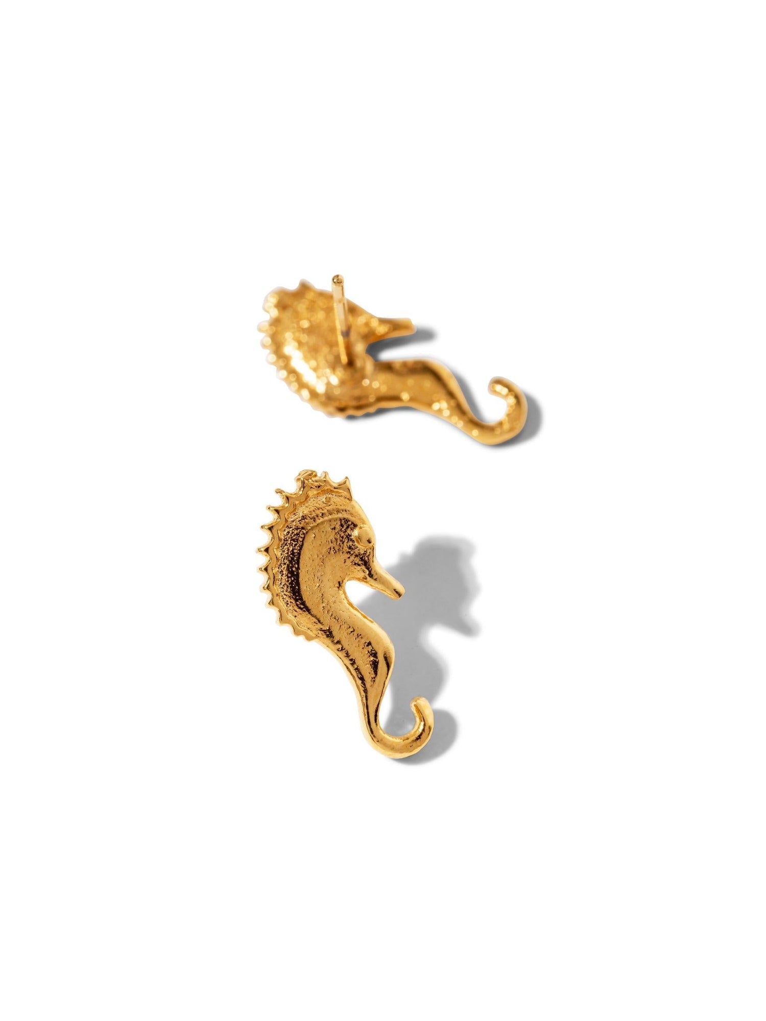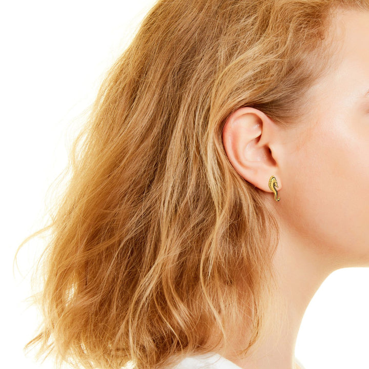 These Gold Sea Scooter Post Earrings by Jaredjamin are a delightful and whimsical accessory that adds a touch of oceanic joy to your look. These stunning seahorse stud earrings are plated in luxurious 18K gold over brass, creating a chic and playful statement. They are a symbol of carefree elegance and are perfect for pairing with other personal jewelry for a unique and stylish ensemble. Their fun design makes them a must-have for those who love to express their personality through their accessories.