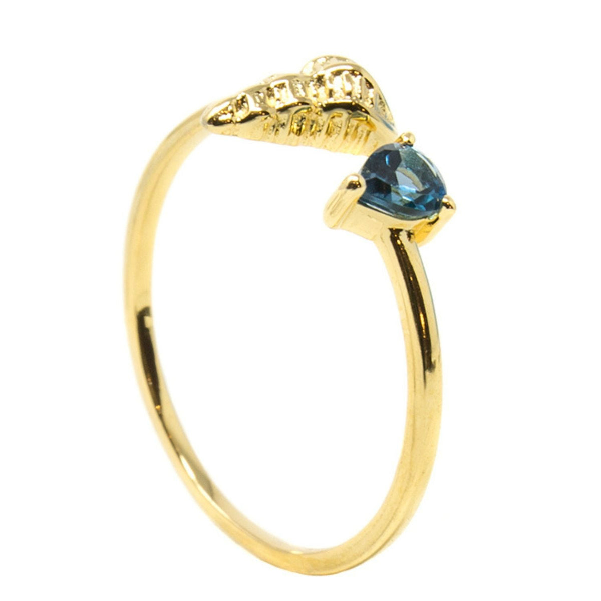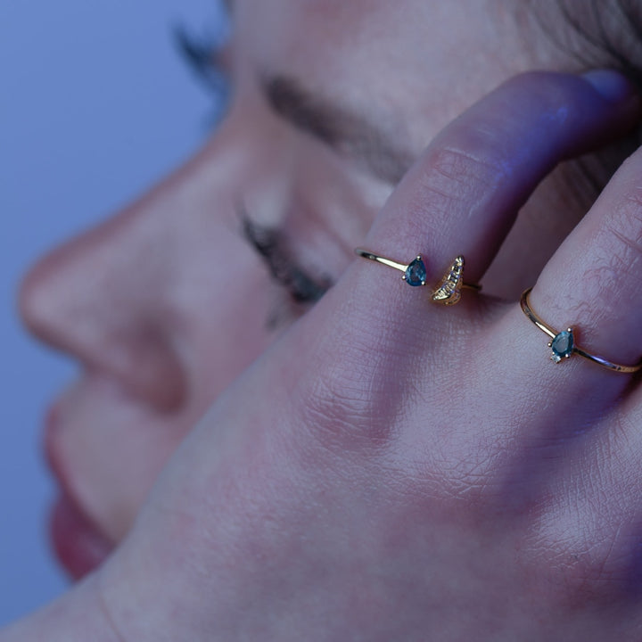 Cast in 925 solid sterling silver with 18k yellow gold vermeil. Set with a faceted blue topaz gemstone.