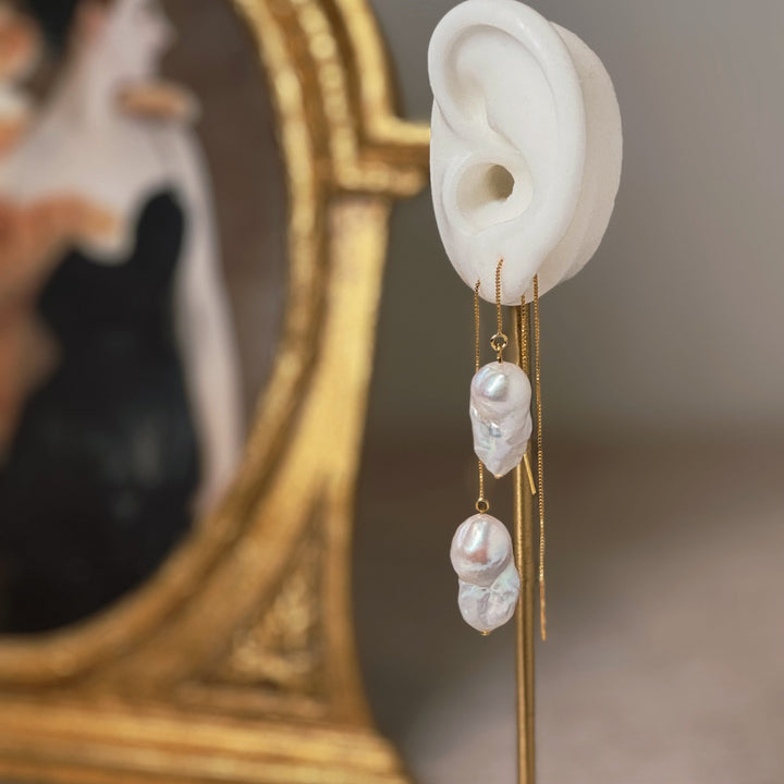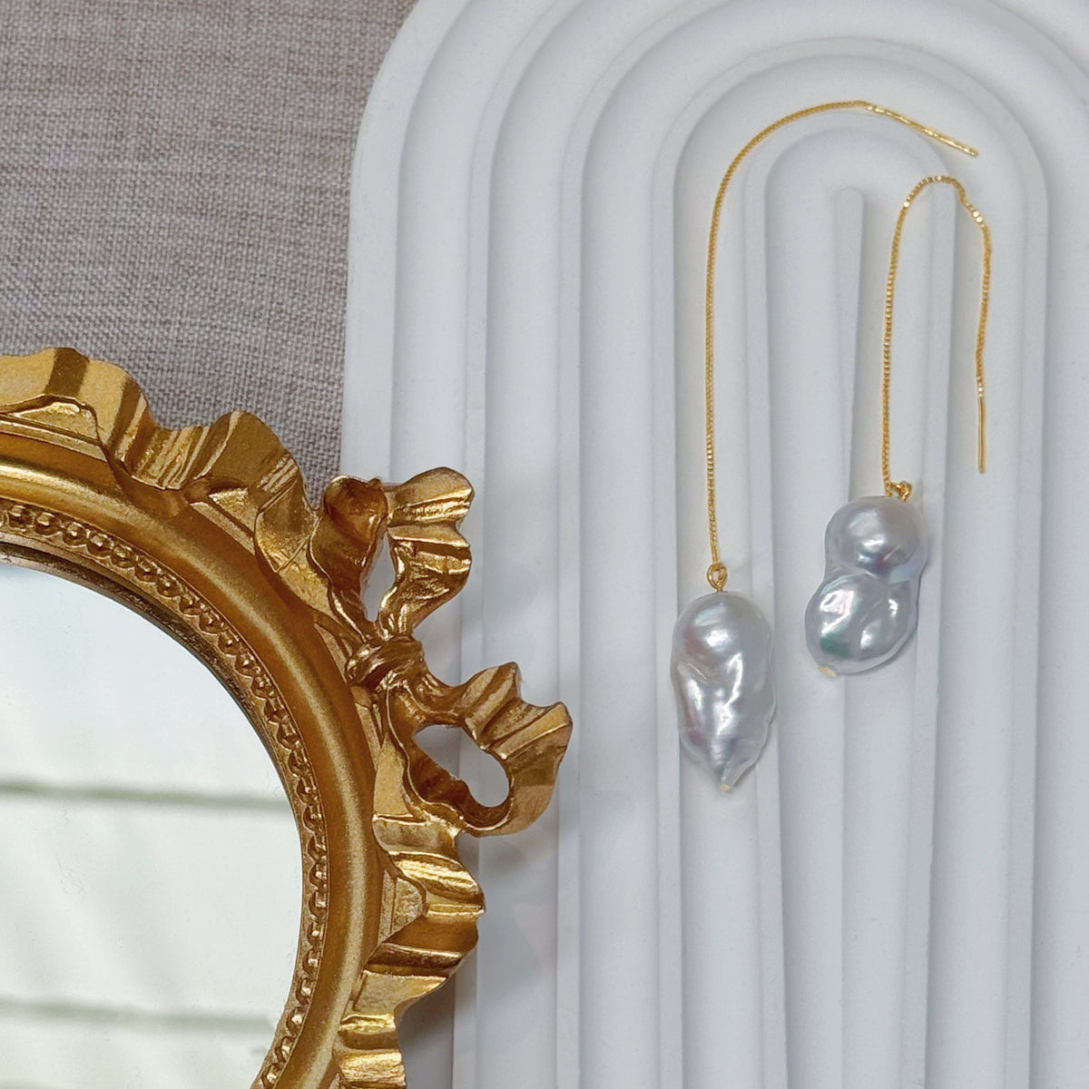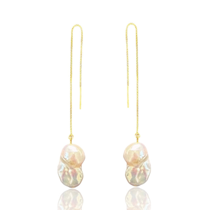These threader earrings are made with 925 Silver and gold-filled material. They feature natural baroque pearls that are 2cm in size. The earrings are hypoallergenic.