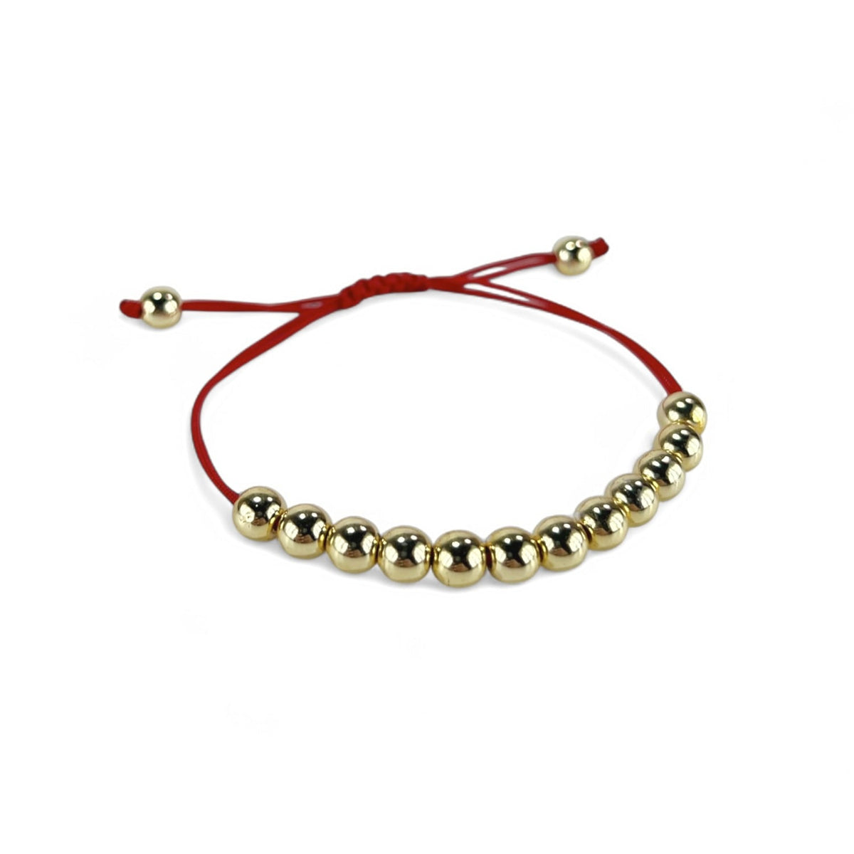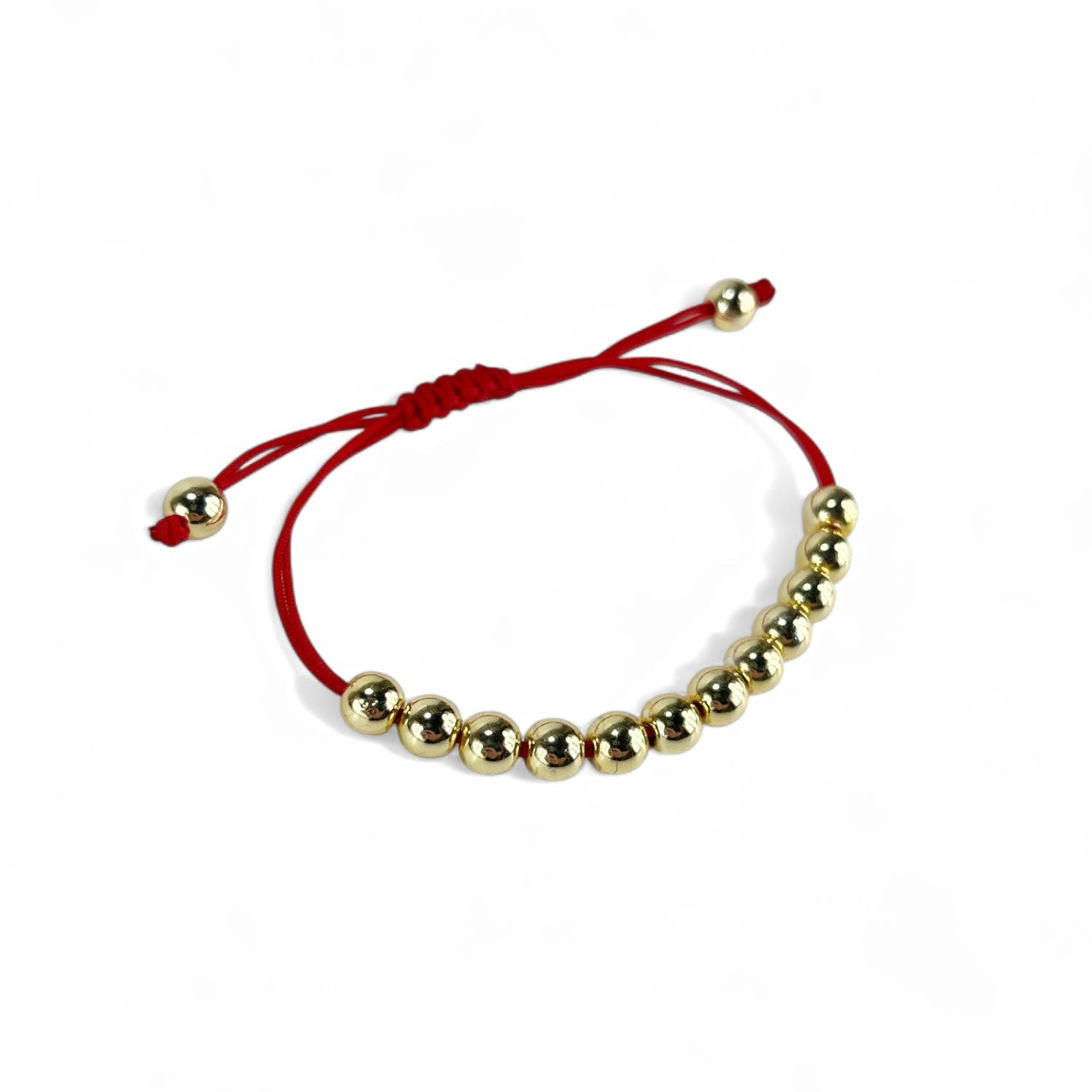 This bracelet is handcrafted with 24k gold-plated brass beads and a red adjustable cord. It features a sliding knot for adjustment and is nickel-free.