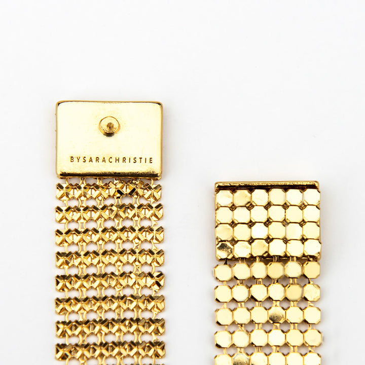 These The Caress Earring - Gold by Bysarachristie are a sensual and elegant accessory. The longline chainmail design sways gracefully with every movement, creating a gentle, seductive touch against your skin. Their real gold-plated finish adds a touch of glamour, while their lightweight design ensures comfort. These bold yet graceful earrings are a statement piece that will illuminate your skin and capture attention.