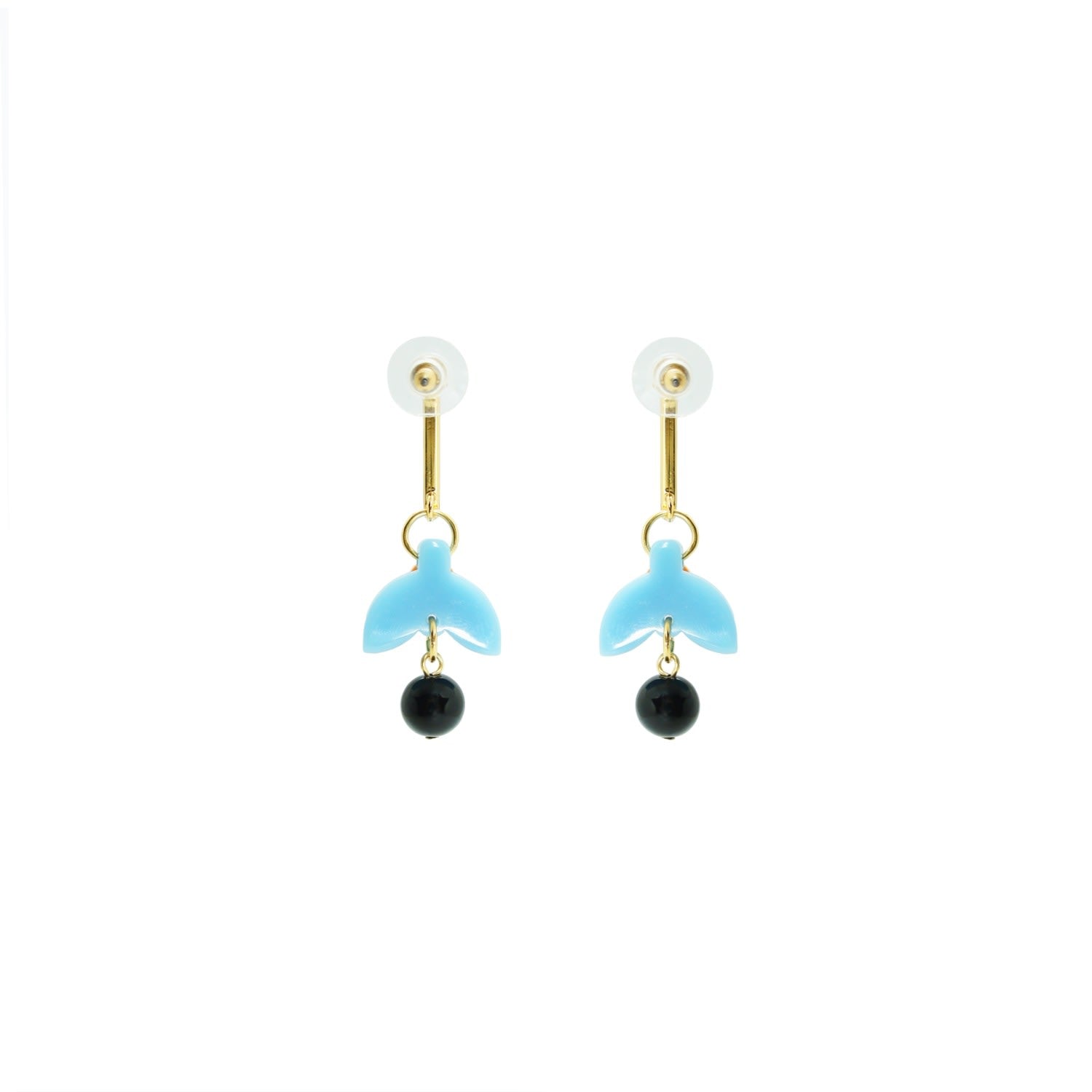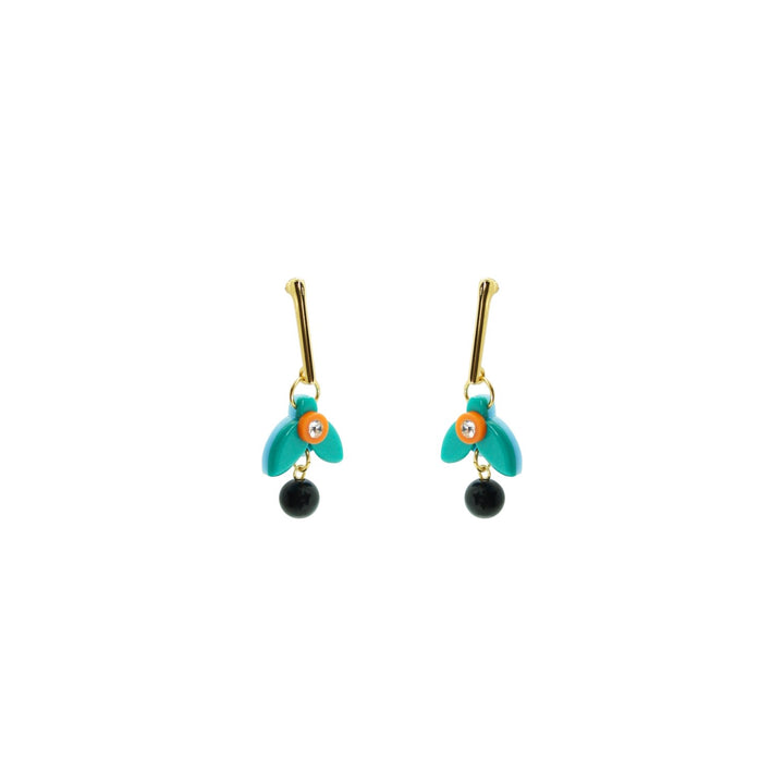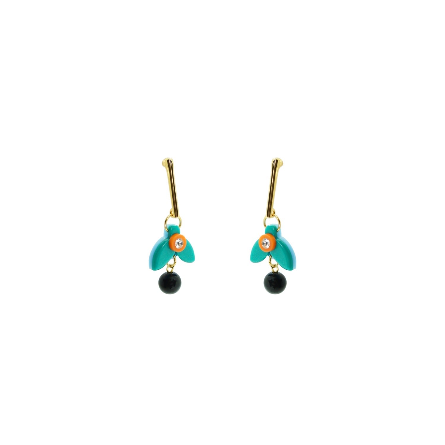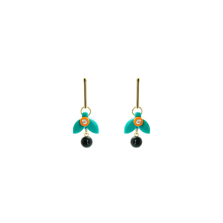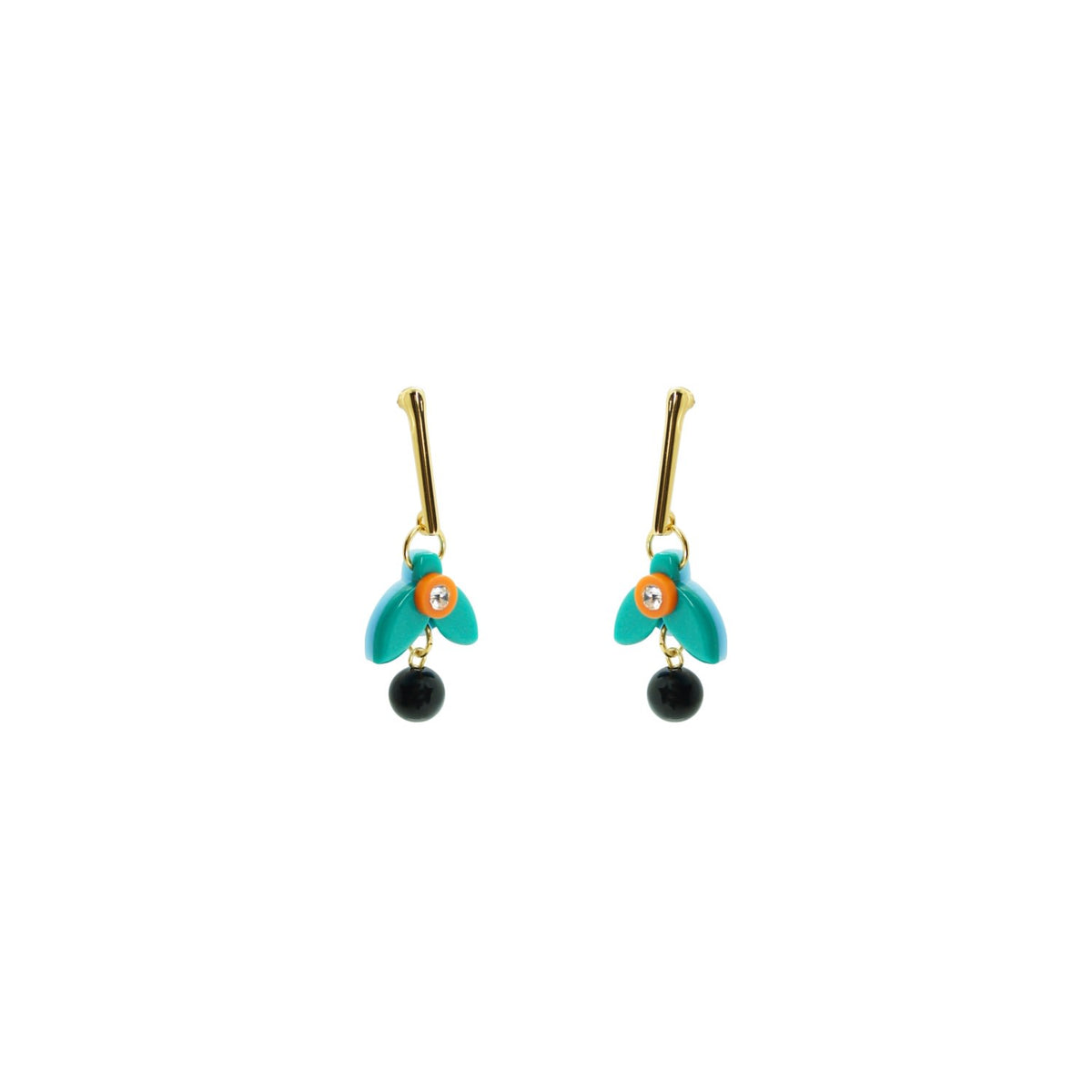 These earrings are handmade from acrylic with glass rhinestone and synthetic bead applications, featuring a gold-finished zamak stem and a stainless steel pin.