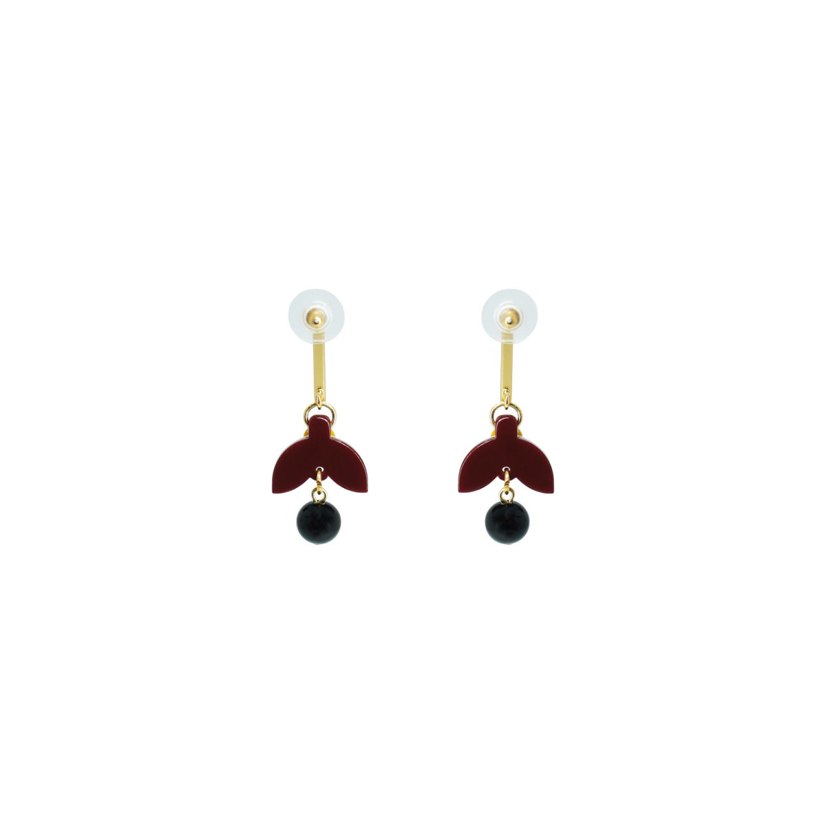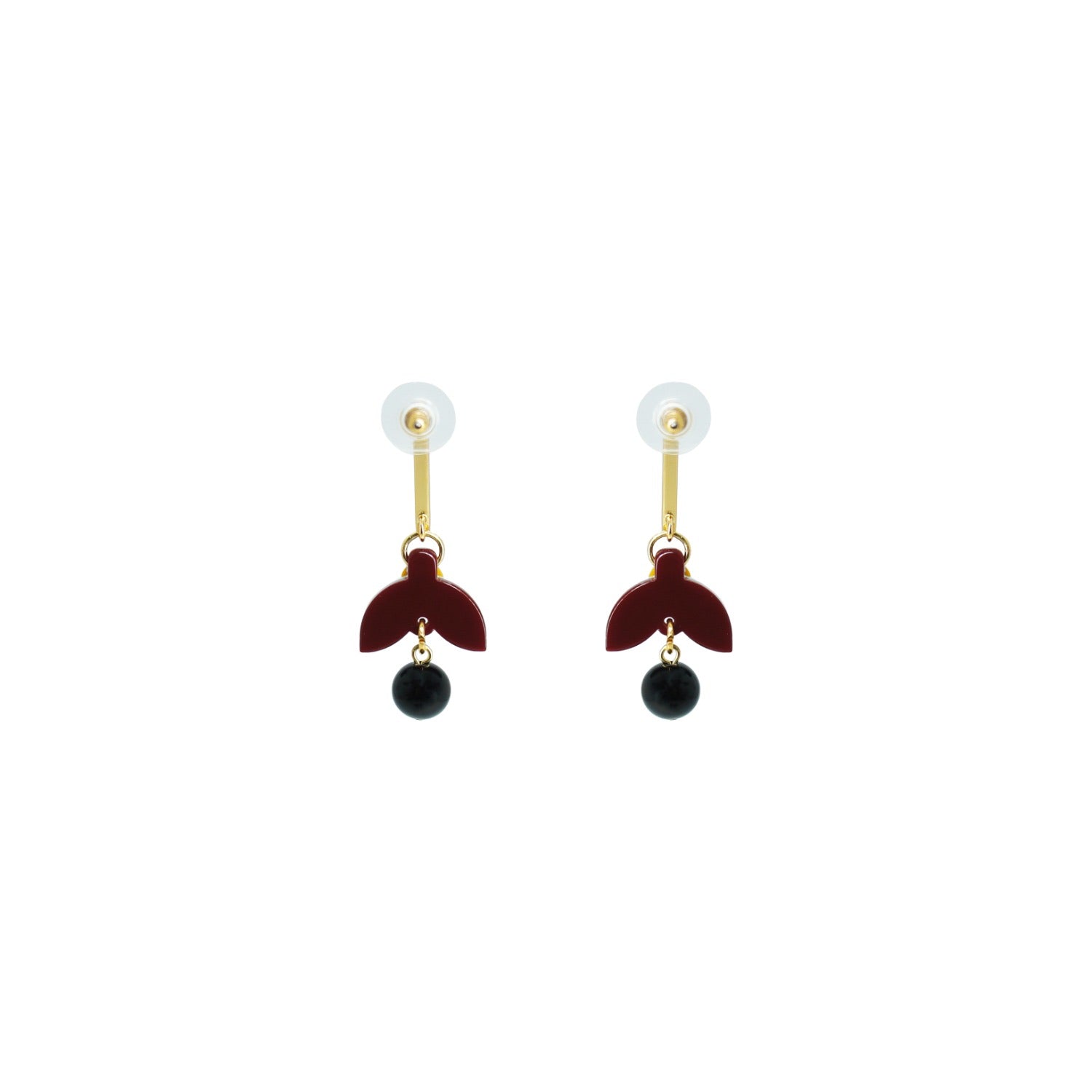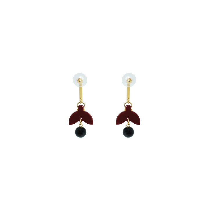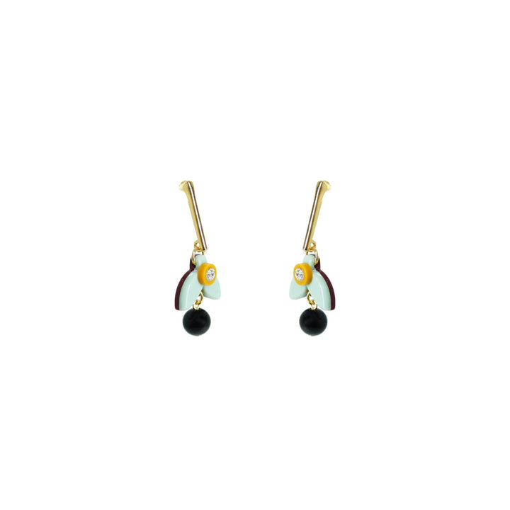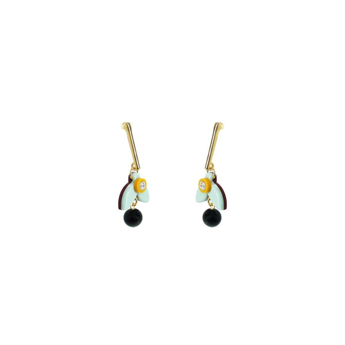 These earrings are handmade from acrylic with glass rhinestone and synthetic bead applications, featuring a gold-finished zamak stem and a stainless steel pin.