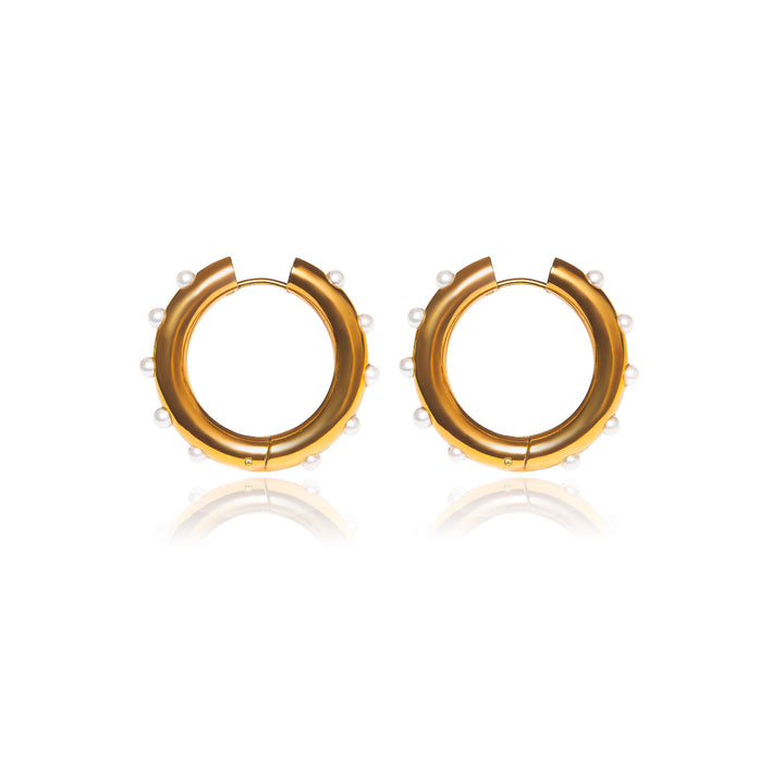 These earrings have small pearls around the hoop. The base material is not specified.