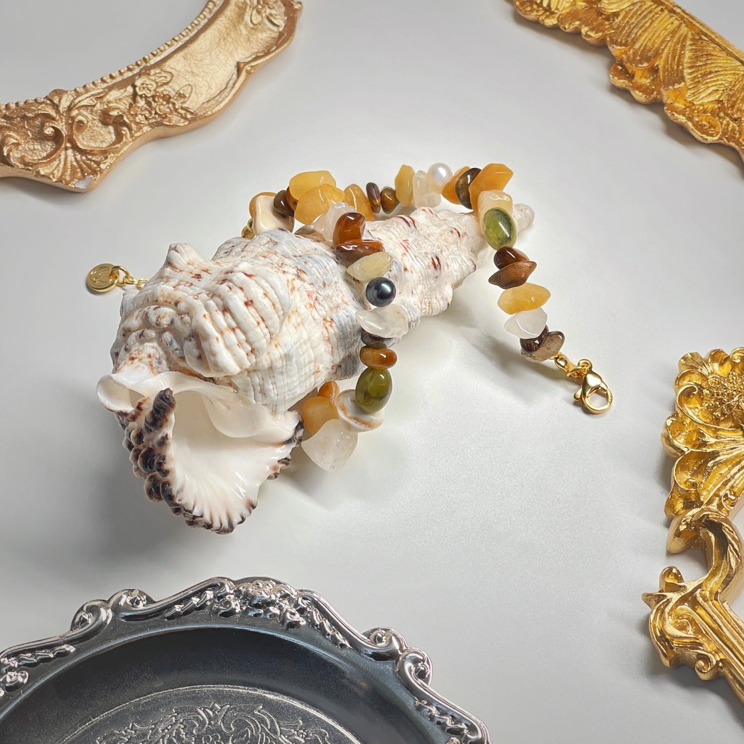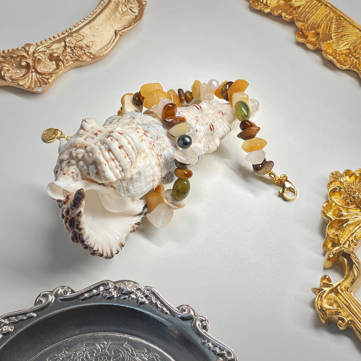 This Autumn Elegance Gemstone And Pearl Bracelet by Ninemoo is inspired by the ethereal beauty of autumn forest nymphs. This unique piece captures nature’s transformation with a whimsical and enchanting aesthetic. The bracelet can be worn alone or as part of a matching set. The combination of freshwater pearls and natural gemstones creates a luxurious and elegant accessory that will complement your look and bring a touch of the outdoors to your style.