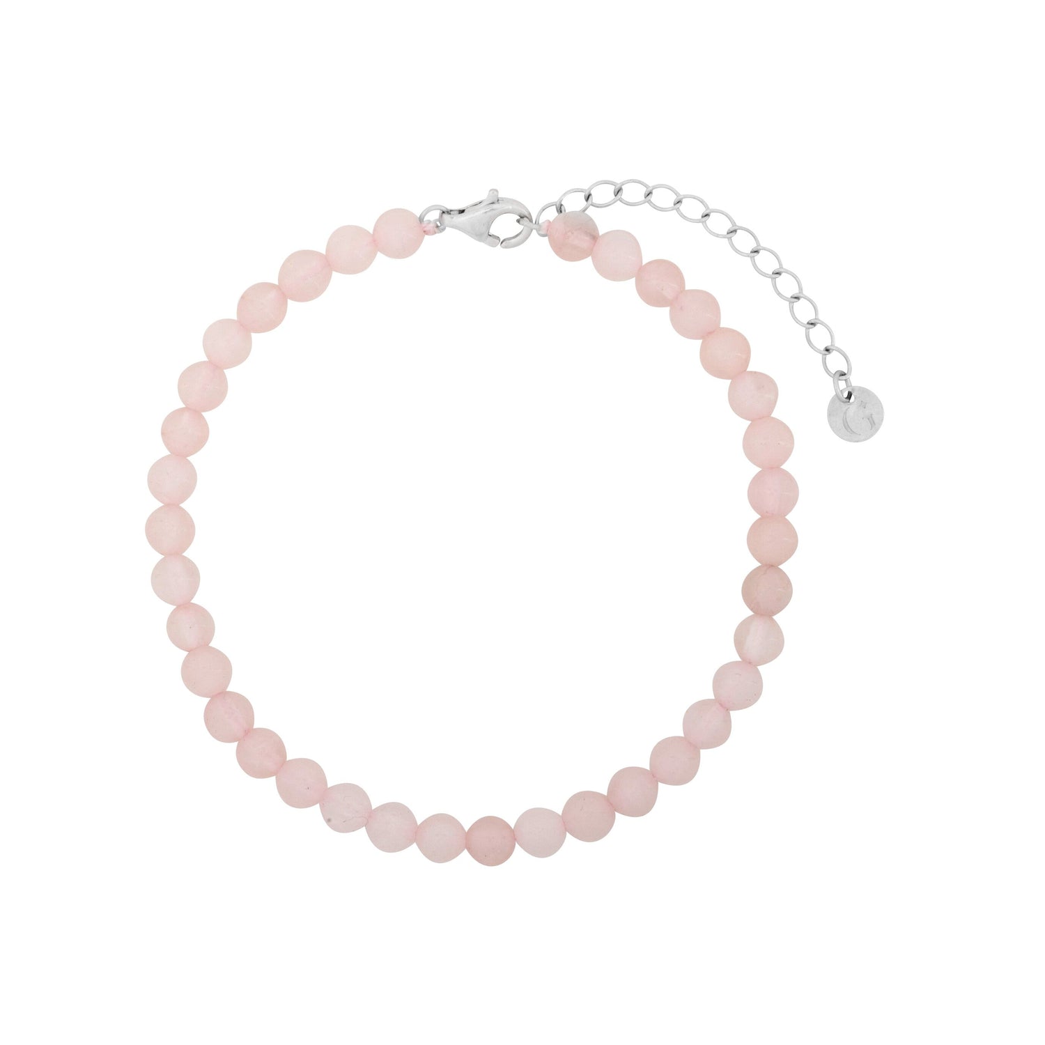 This bracelet is crafted with natural, polished rose quartz crystals, hand-strung onto a durable beading cord with sterling silver hardware. It includes a 4cm extension chain.