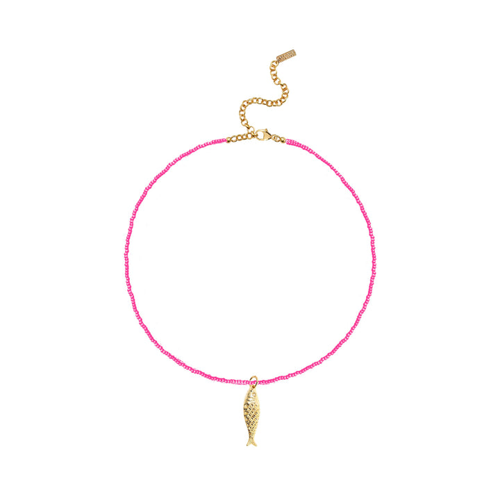 This Lucky Fish Necklace - Pink by Adriana Pappas Designs is a trendy yet timeless accessory with a whimsical touch. The unique, handcrafted piece features a lucky fish design with pink glass beads and a sparkling cubic zirconia stone. This versatile necklace is perfect for dressing up or down, making it a favorite for any occasion, from brunch to a night out.