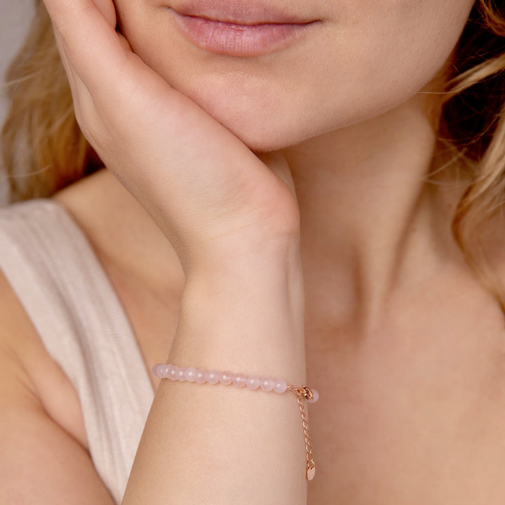This bracelet is made with natural, polished rose quartz crystals hand-strung on a durable beading cord with sterling silver hardware plated in 18k rose gold. It includes a 4cm extension chain.