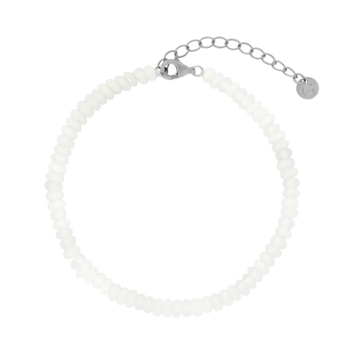 This bracelet features rounded moonstone beads. The clasp and extension chain are crafted from hallmarked sterling silver and are plated in rhodium.