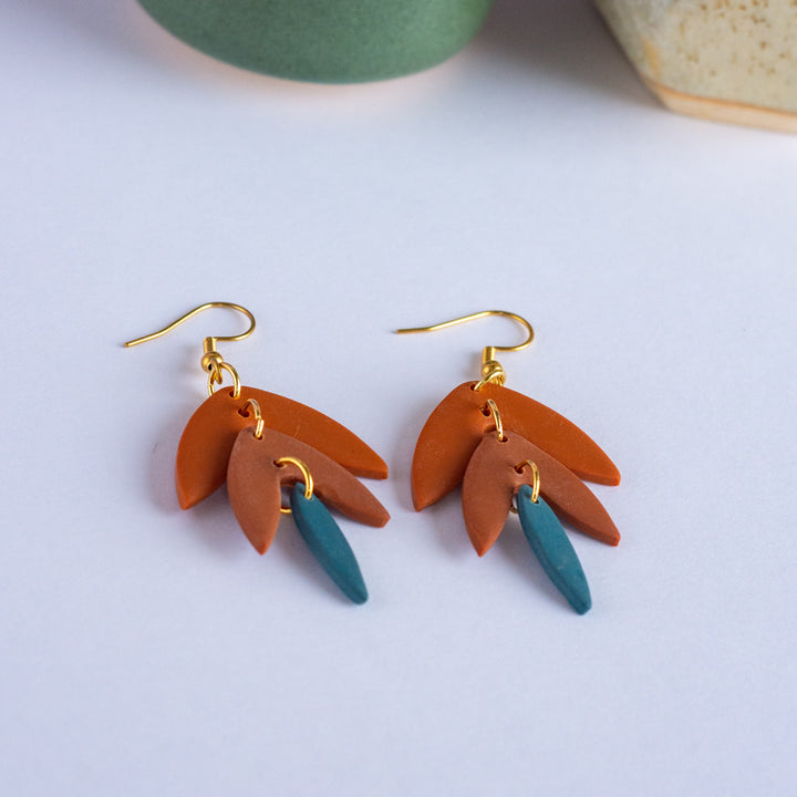 These Therese Orange and Blue Tiered Earrings by Ziolla Designs feature cascading polymer clay leaves in warm orange and cool blue. Handcrafted with precision, they are bold, lightweight, and perfect for sensitive ears—each pair offering a unique finish.