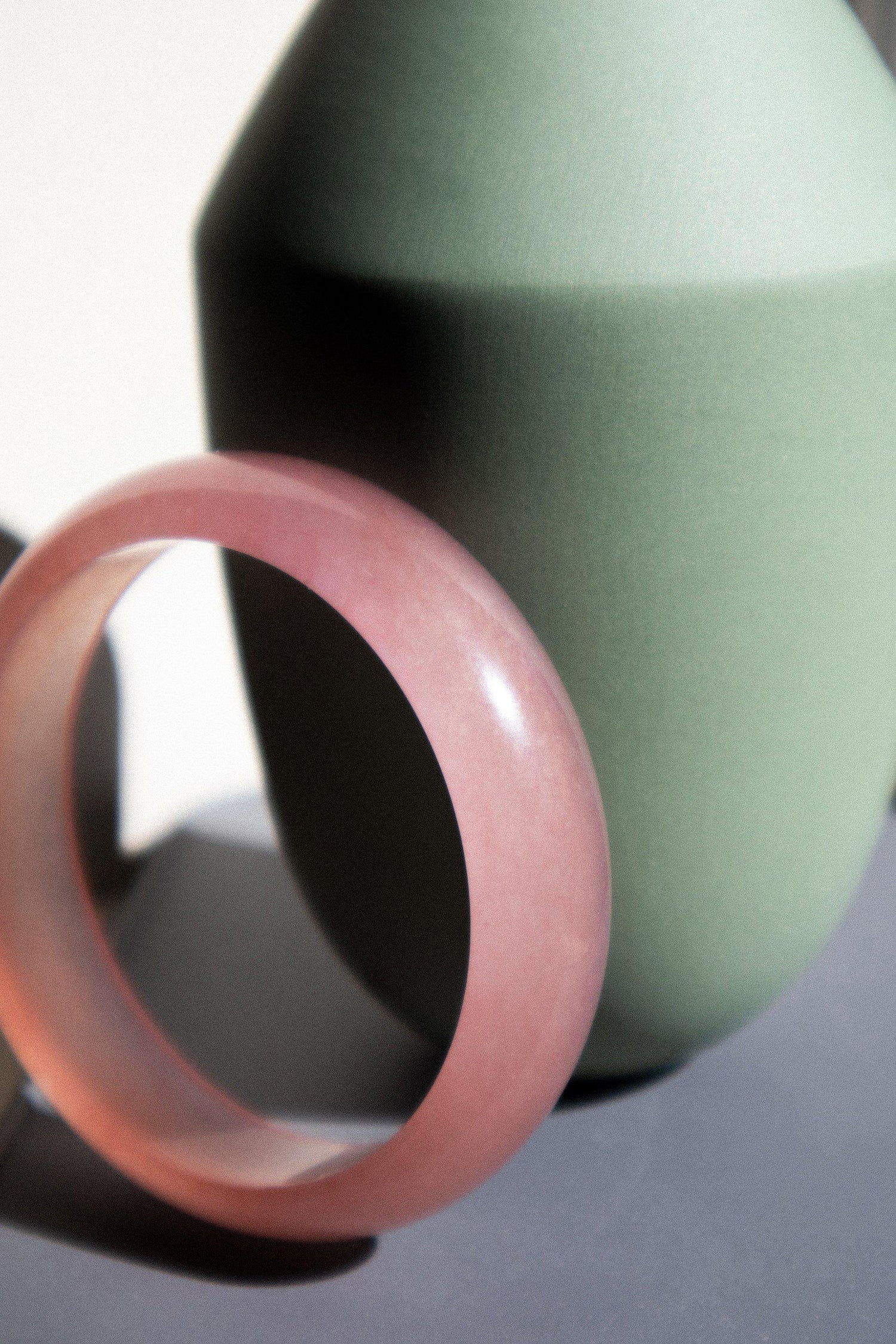 The Blush Pink Jade Stone Bangle by Seree is a beautifully polished bangle with a warm, rosy hue. It is made from natural blush pink jade and is hand-carved and polished. The bangle has delicate veining, and its natural characteristics mean each piece will vary slightly. The bangle is available in different sizes from XS to L.