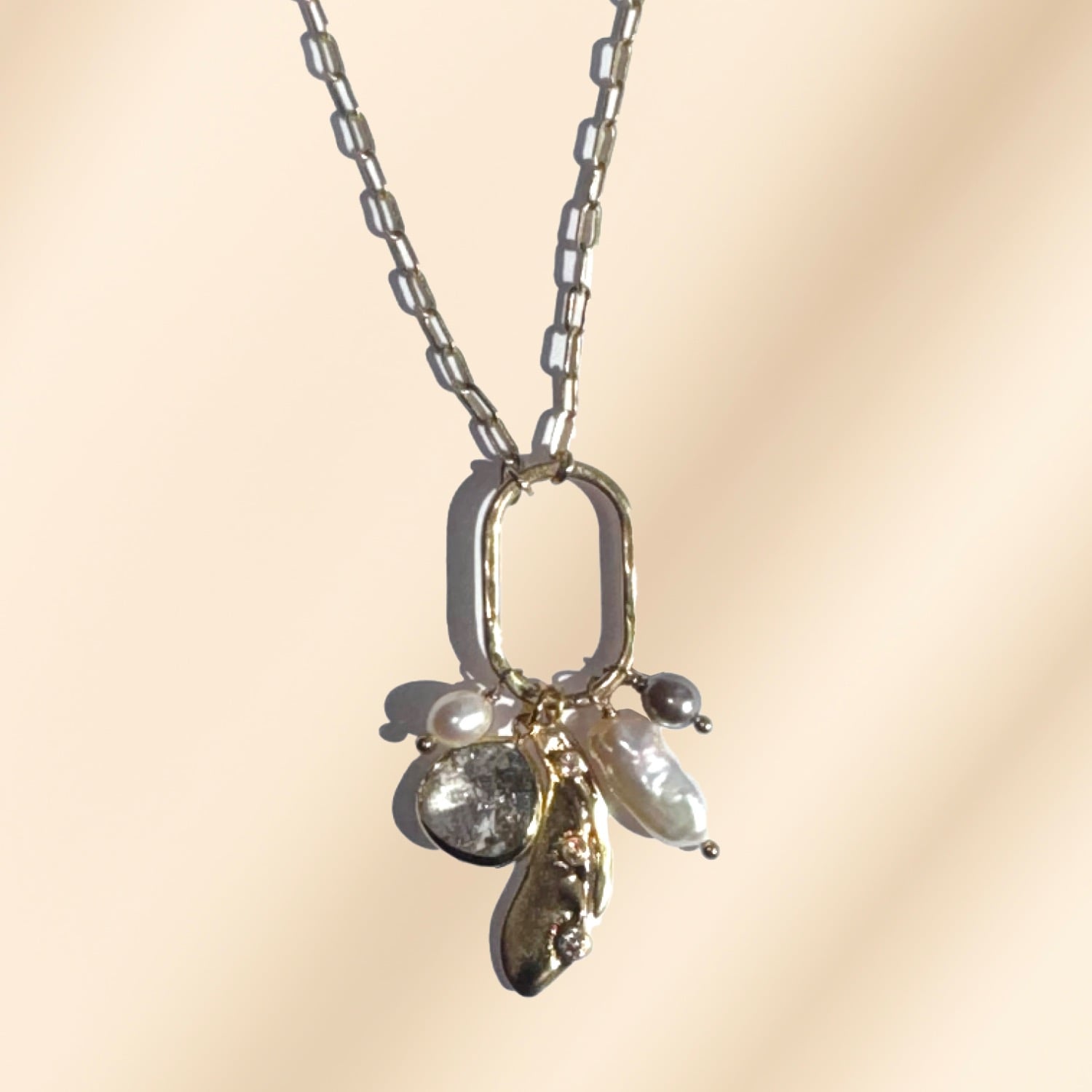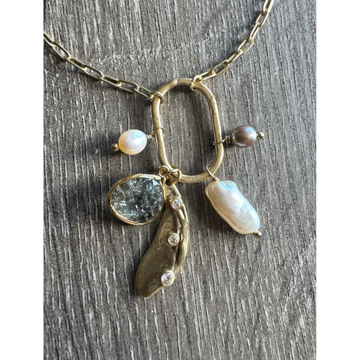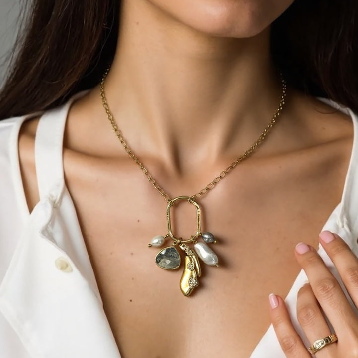 This Radiance Charm Natural Biwa Pearl Smoky Quartz Necklace by Rare Matters Jewelry is a playful and elegant piece that celebrates organic beauty and individuality. It features a delicate balance of textures with smoky quartz, freshwater pearls, and feather charms adorned with sparkling cubic zirconia. The charms are thoughtfully arranged on a 14kt real gold-plated link, creating a timeless statement of effortless sophistication. This necklace is a beautiful symbol of raw elegance and the beauty found in imperfect moments.