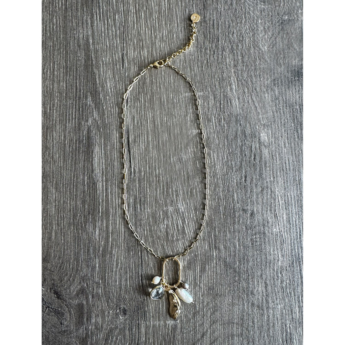 This necklace is crafted from brass with 14Kt real gold plating. It features gemstones, cubic zirconia, freshwater pearls, and natural biwa pearls.