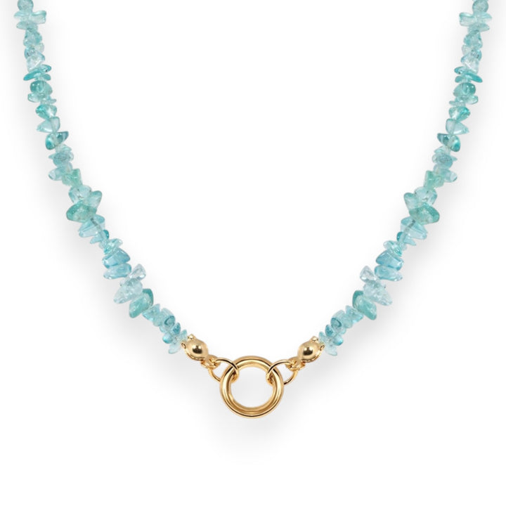 This necklace is handmade from natural Apatite beaded gemstone chips. It features a 14K gold-filled charm keeper clasp and is available in a 16-inch classic length.