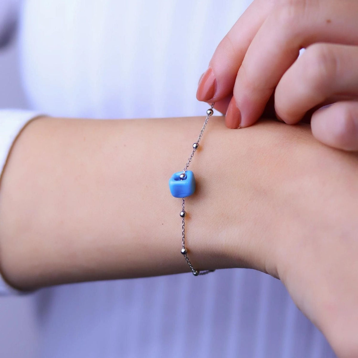 This bracelet is crafted from fine sterling silver with a beaded satellite chain. It is adorned with a unique turquoise gemstone.