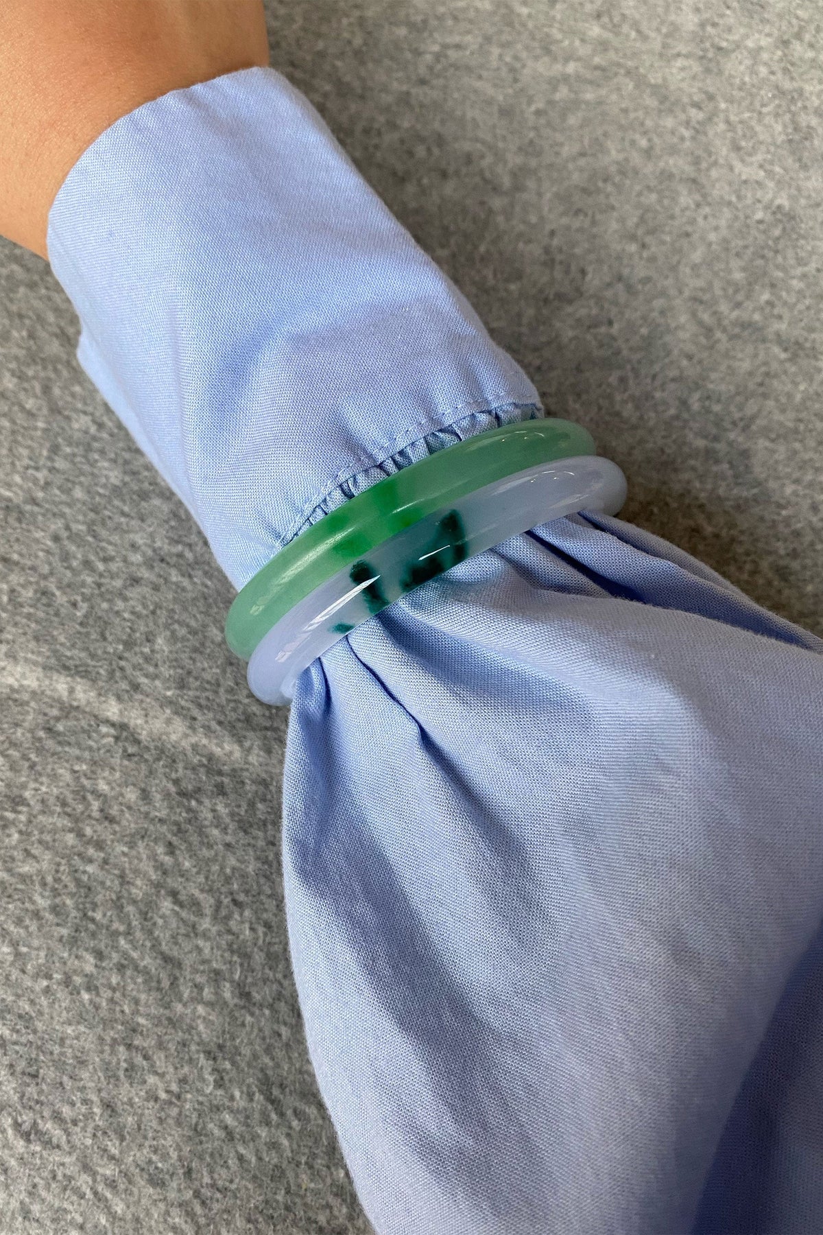 This bangle is crafted from natural mottled green quartzite. It is 9mm thick and 9mm wide and is available in various diameters.