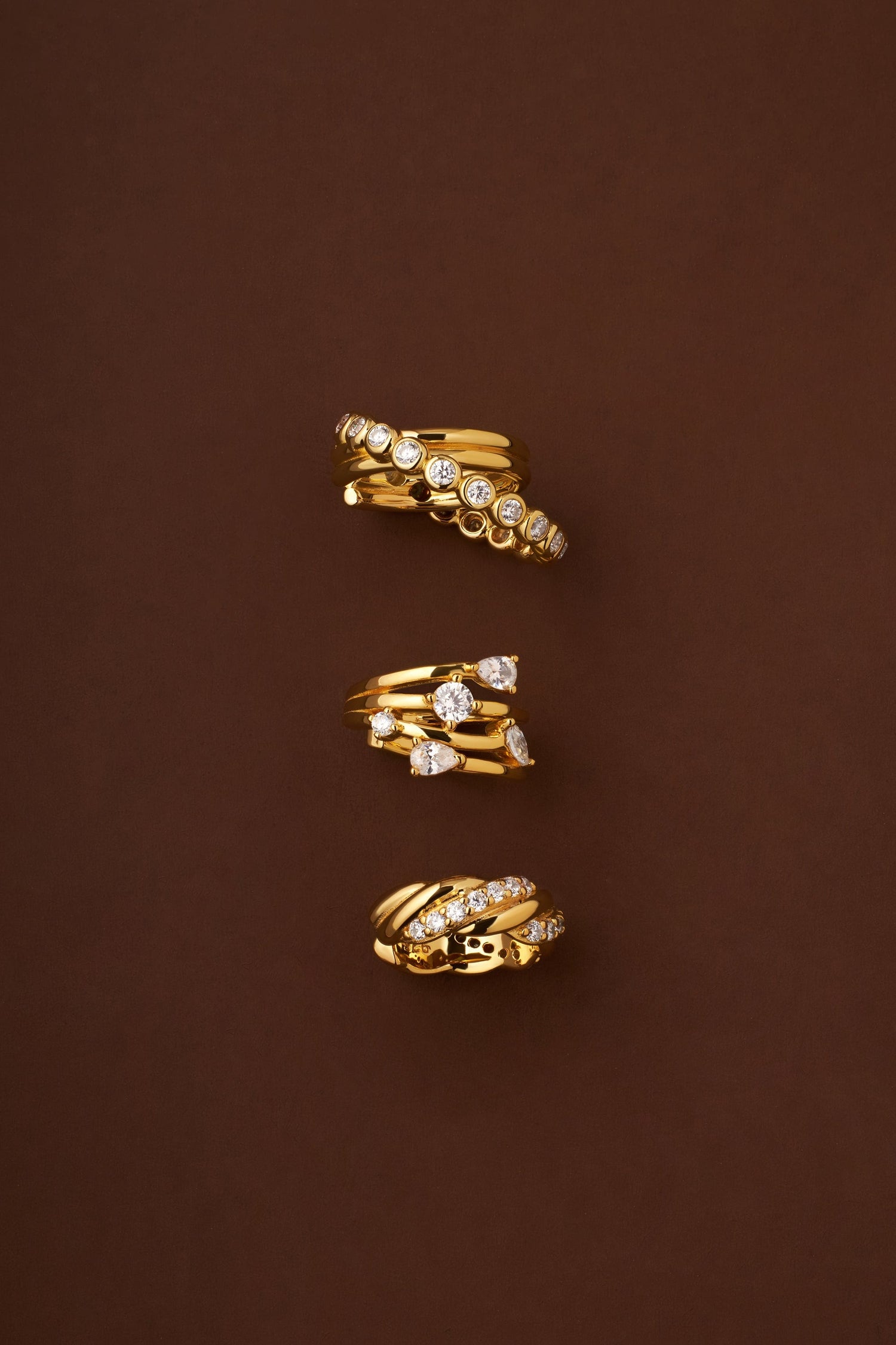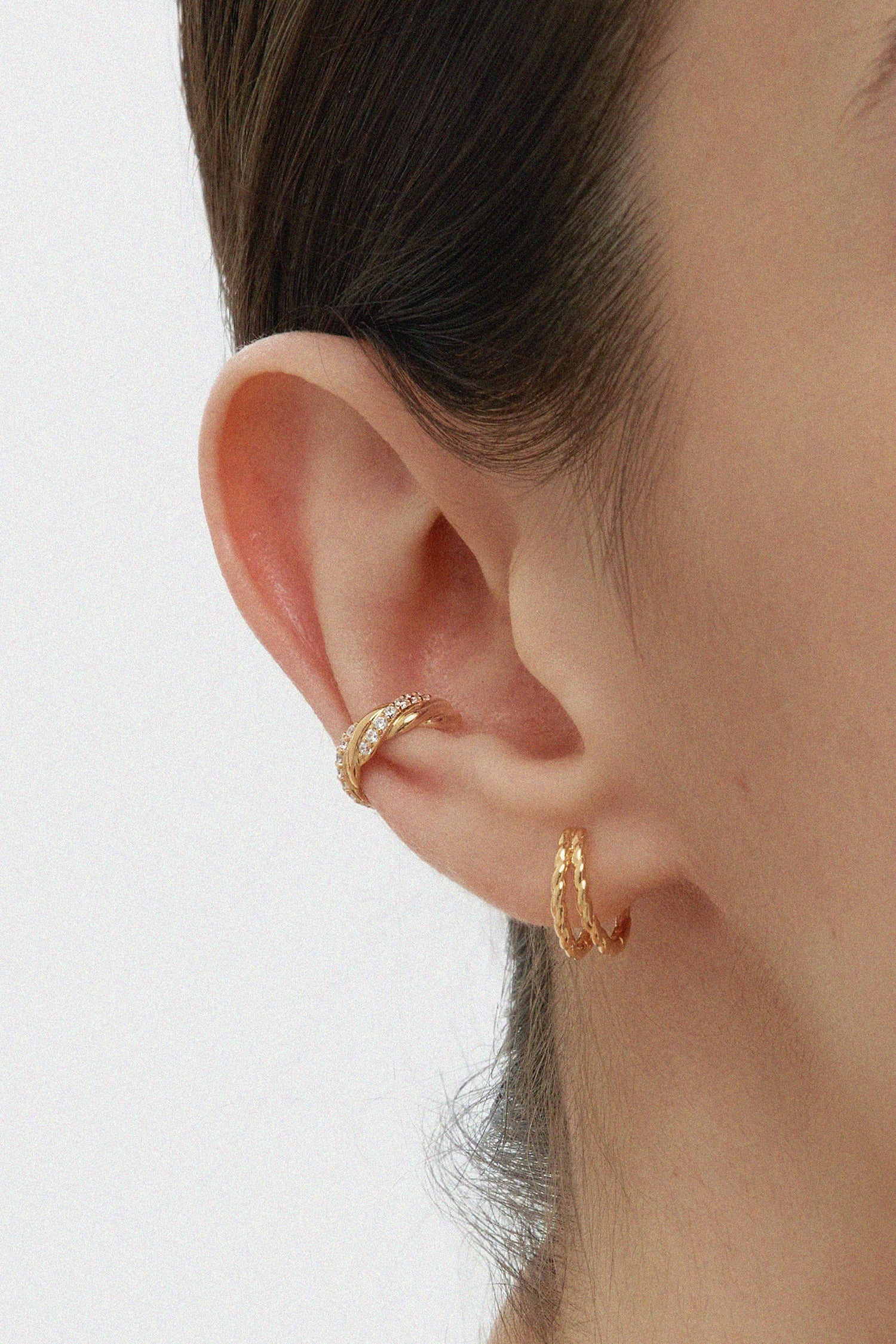 This ear cuff features a twisted design and is crafted from an 18k gold-plated sterling silver base. It is adorned with multiple small zircon stones.