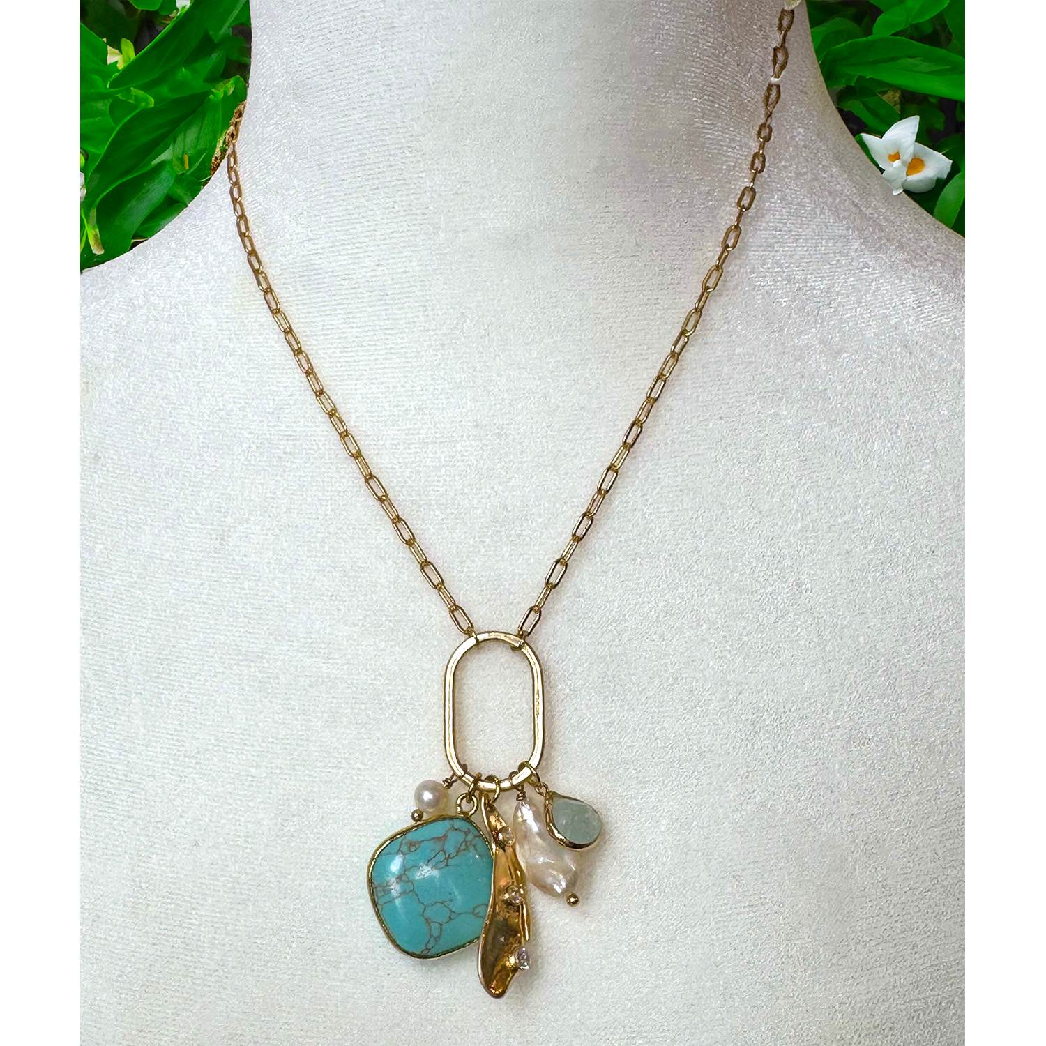 This necklace is made of brass with 14Kt real gold plating. It features turquoise, freshwater pearls, Biwa pearls, and CZ crackled glass. Avoid water, perfumes, and lotions.