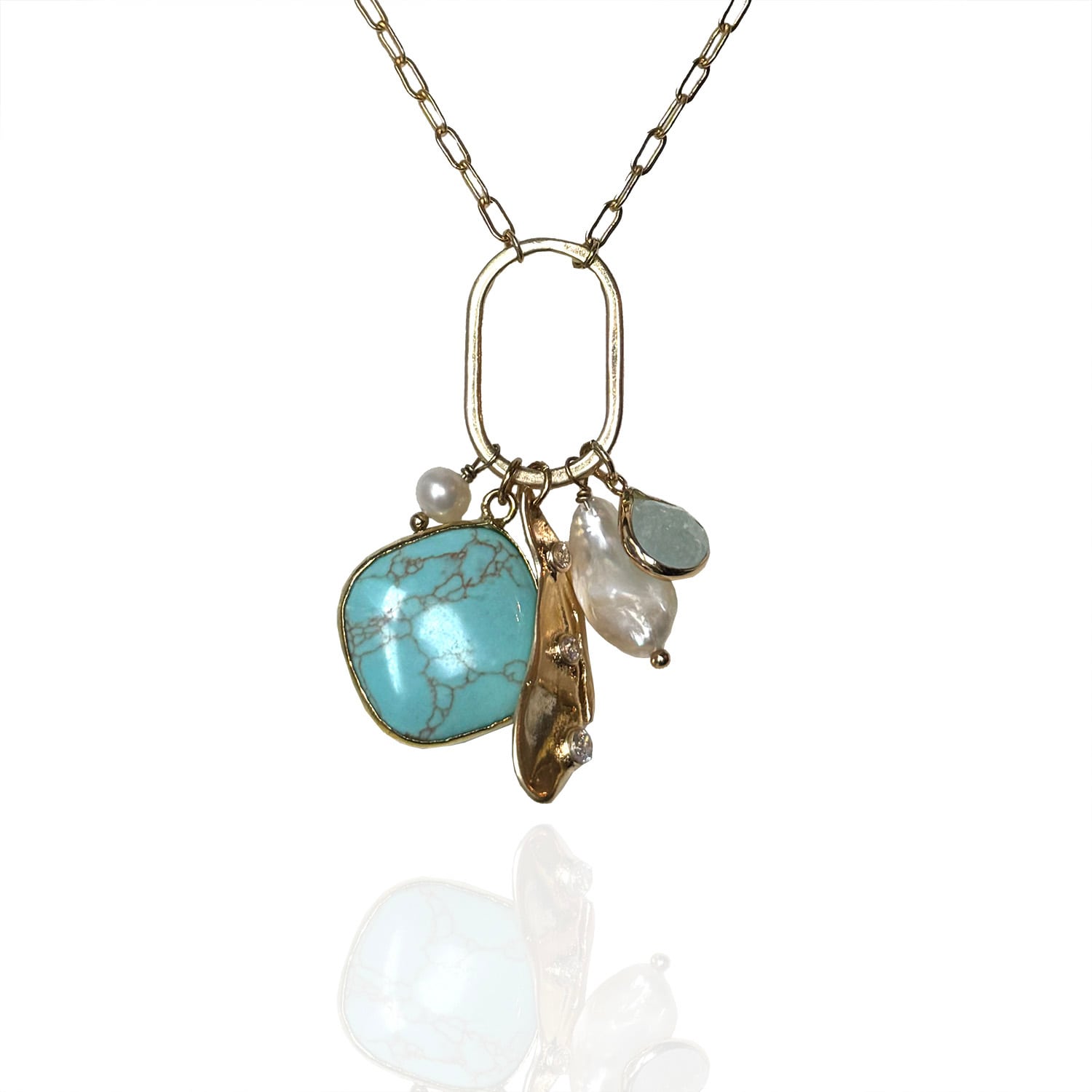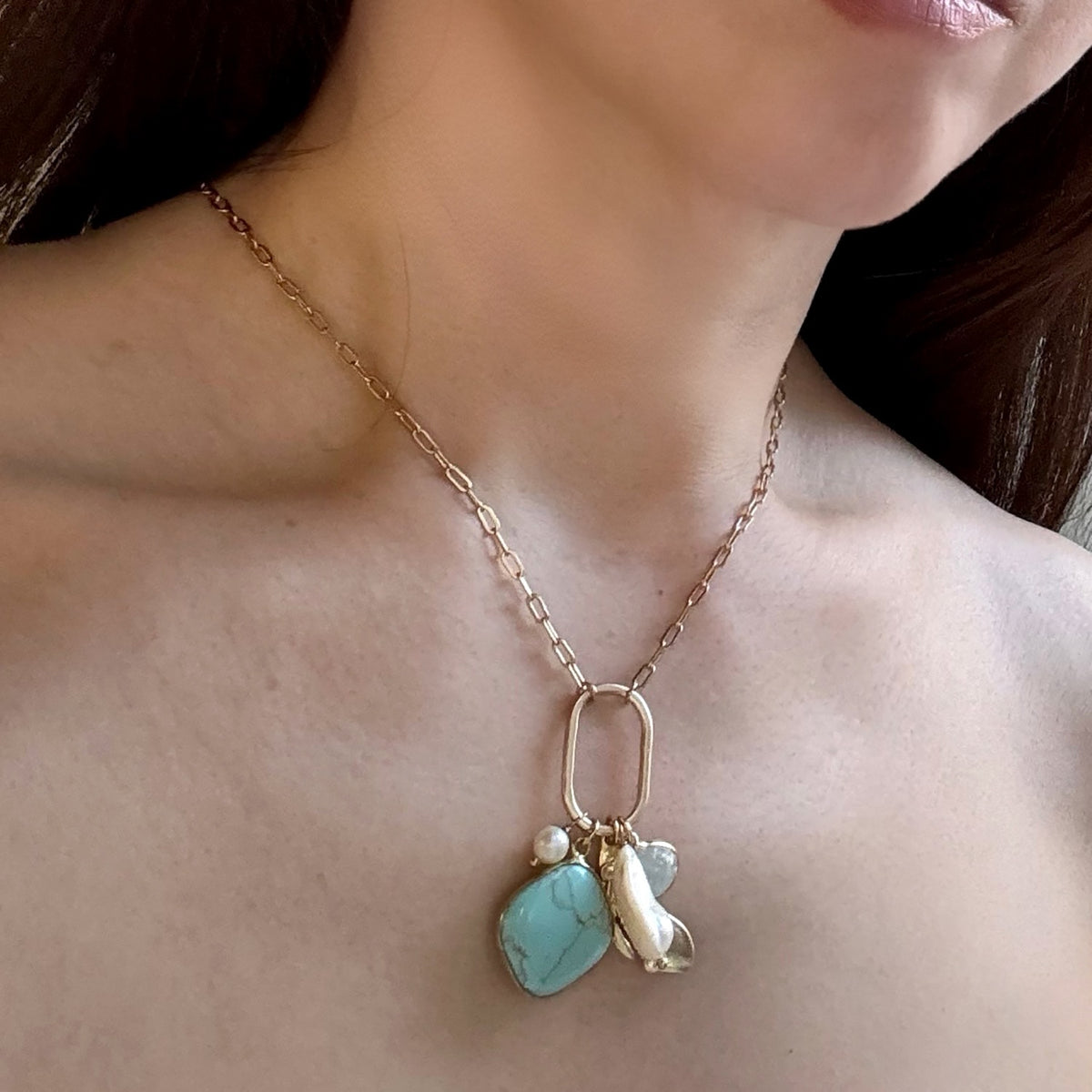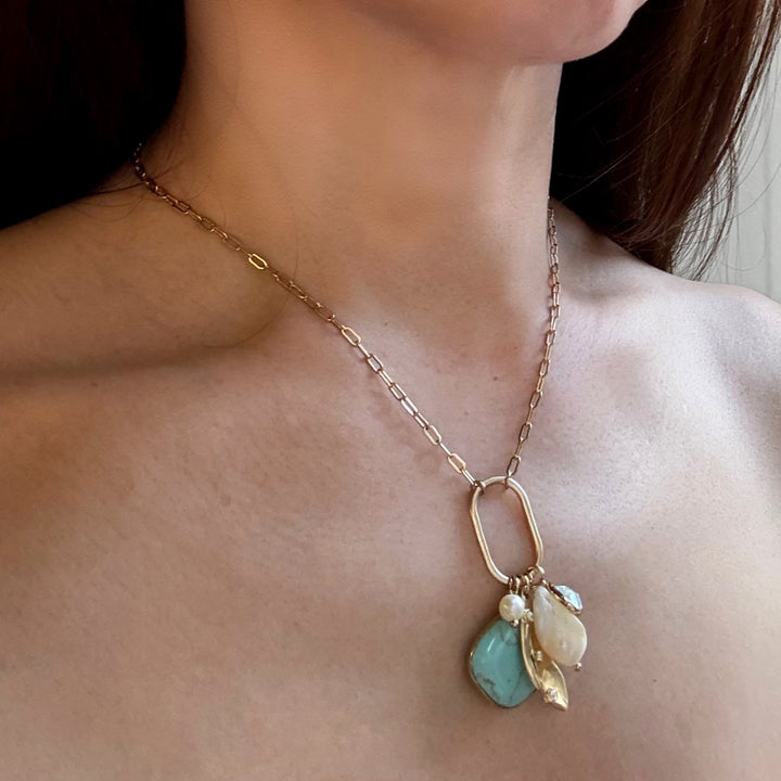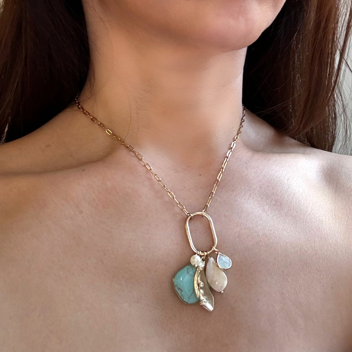 The Radiance Charm Turquoise Necklace by Rare Matters Jewelry is a playful yet elegant piece that embraces organic beauty. It features a dynamic mix of textures and forms, including a square-shaped turquoise bezel, freshwater pearls, a long organic Biwa pearl, and feather-shaped brass charms with sparkling CZ. This necklace is a celebration of nature's imperfect beauty and your own unique rhythm.