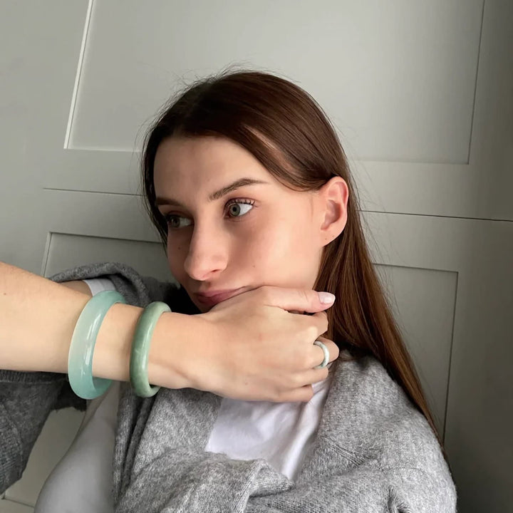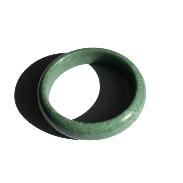 Hand-carved and polished natural jadeite. Weight: 45 g. Thickness: 5 mm. Width: 6 mm. Sizes: XS (54–56 mm), S (57–58 mm), M (59–60 mm), L (61–62 mm).