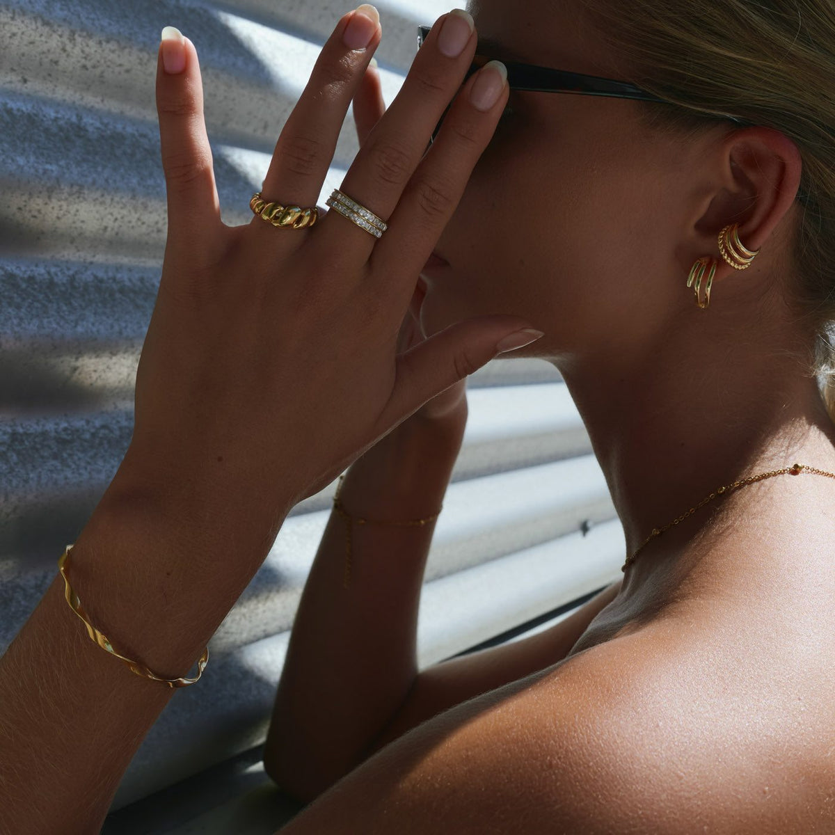 The Juni - Wavy Twisted Bangle Bracelet Stainless Steel by Timi of Sweden is a versatile and stylish accessory. This twisted bangle is adjustable and made of stainless steel, plated with 18k real gold. It is water-resistant and won't tarnish, making it the ultimate piece of everyday jewelry. This classic and ageless piece can be worn on its own or layered with other bracelets for a more elaborate look. It is also nickel, cadmium, and lead-free.