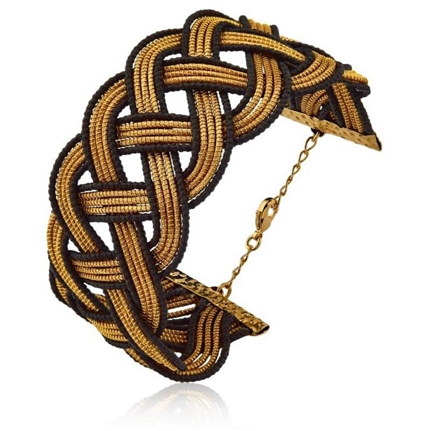 Handwoven from golden grass and black nylon rope fabric. The bracelet features an 18K gold-plated recycled brass lobster claw closure and is hypoallergenic and nickel-free.