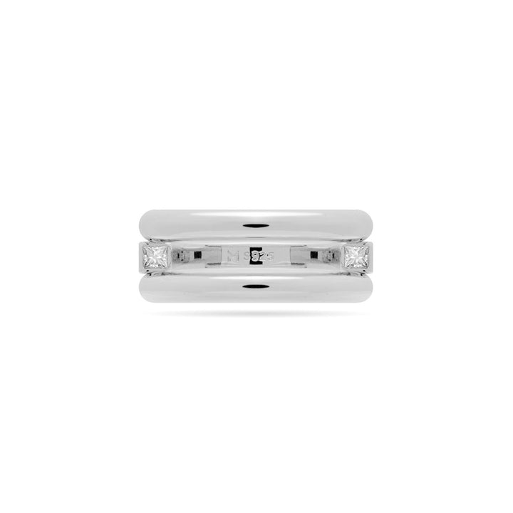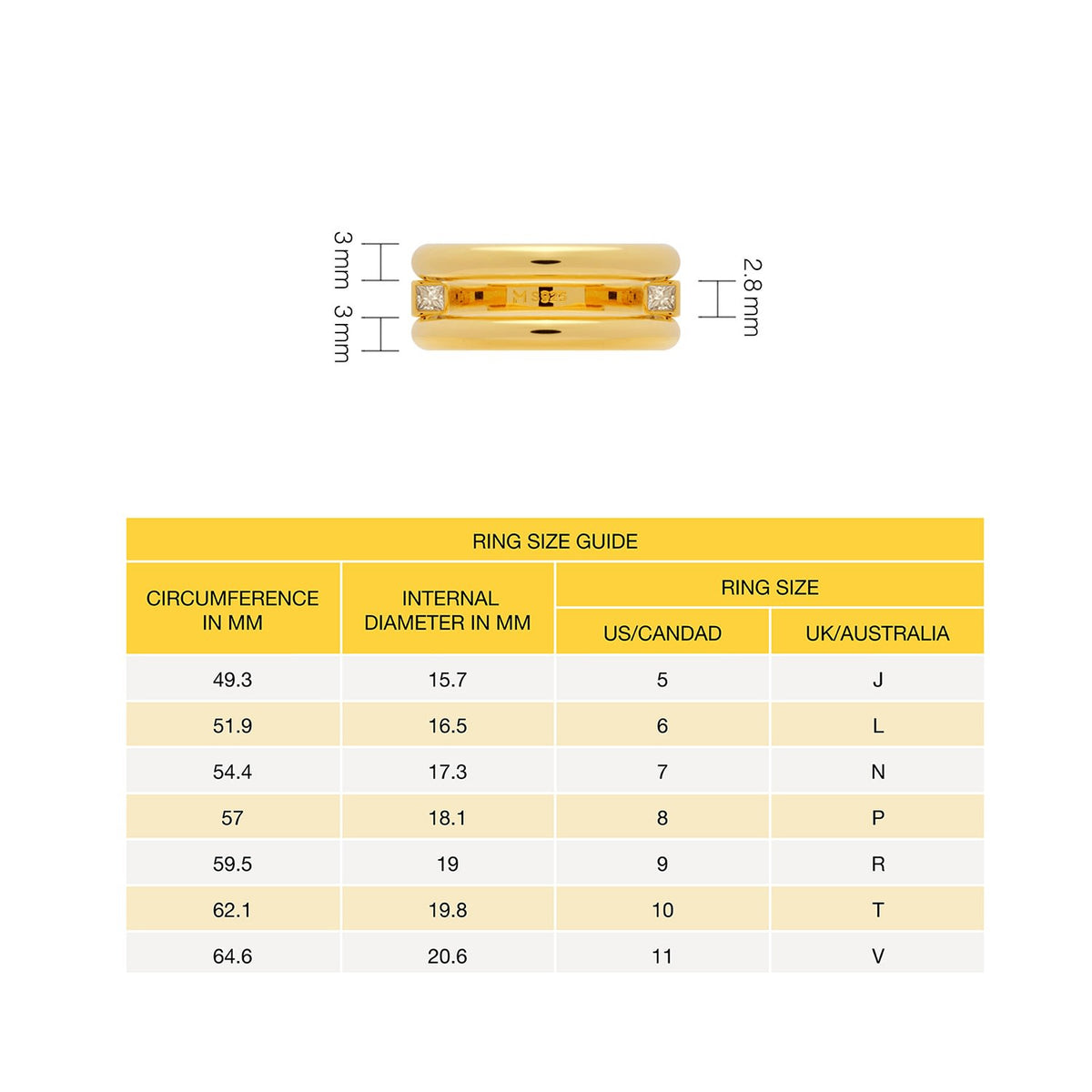 This ring is crafted from 18K vermeil. It features two half-round bands joined by a half-square band and is adorned with clear cubic zirconia (CZ) stones at the six ends.