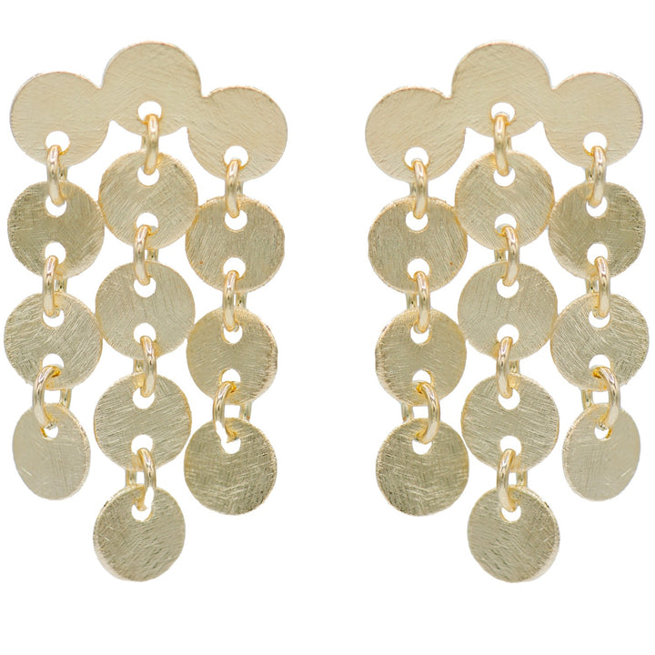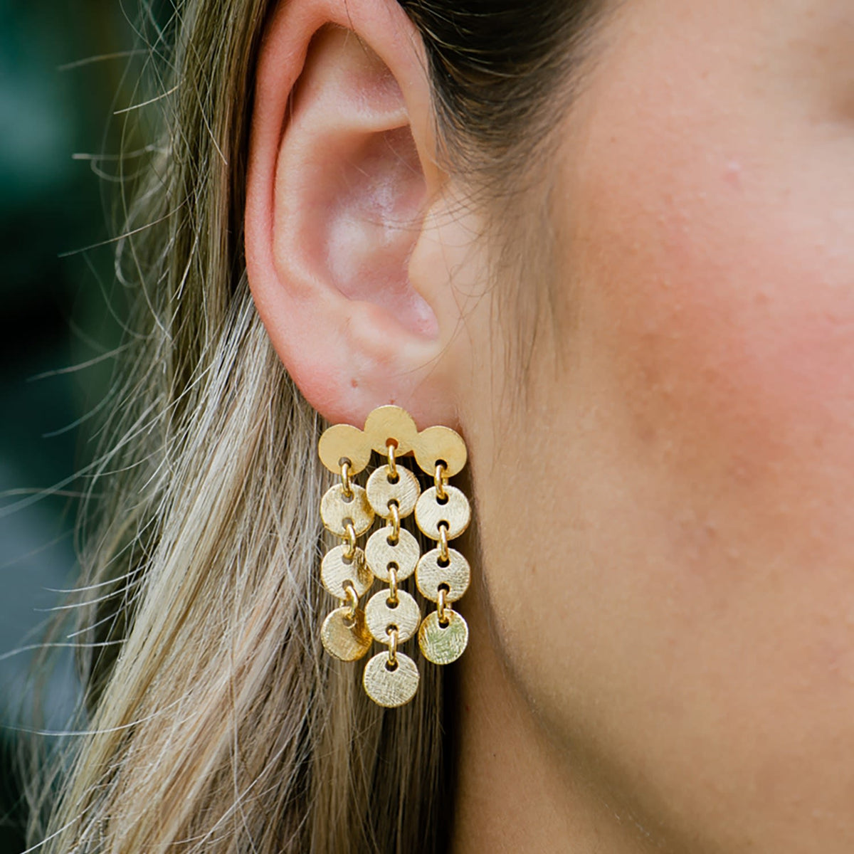These Forest Medium Size Earrings by Marcia Moran are a stunning and sophisticated accessory. Handcrafted in Brazil, these 18k gold-plated brushed chandelier earrings feature delicate hanging coins. Their simple yet elegant design makes them perfect for any occasion, offering a beautiful blend of organic and modern aesthetics. As they are handmade, each piece is unique and may have slight variations in shape and color.
