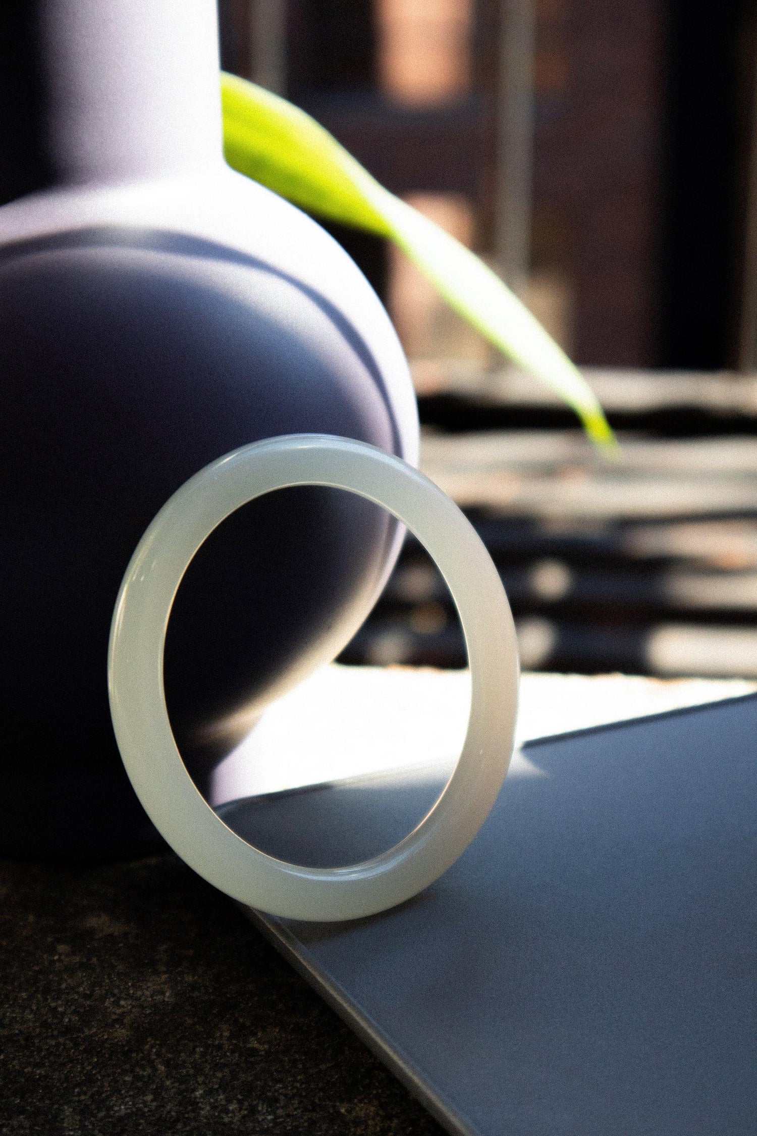 This 1994 Off White Thin Jade Bangle by Seree is a festival-ready accessory that's perfect for both stacking and making a statement. This thin, round nephrite bangle comes in a milky off-white color and can be worn alone as a headliner or paired with bolder bracelets for a more elaborate look. The natural and untreated material means each piece is unique, with slight variations in color and texture, making this a truly personal and timeless piece.