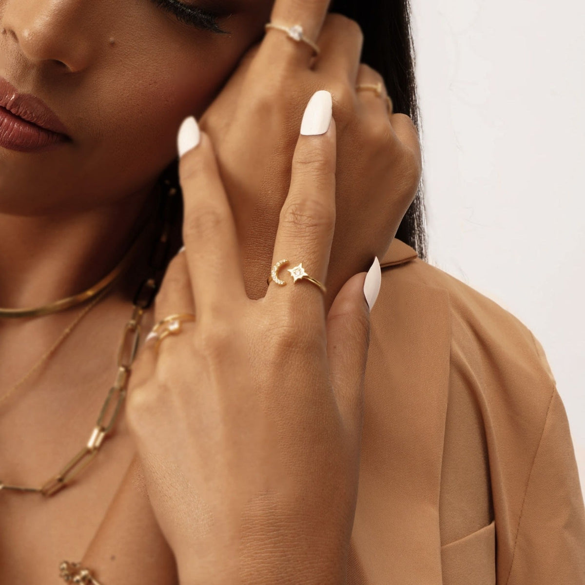 The Gayle Moon Star Dainty Zirconia Stone Ring by Viea is inspired by celestial bodies. It features a star and a moon adorned with zirconia stones on an adjustable open band, ensuring a perfect fit. It can be worn alone or stacked for more sparkle.
