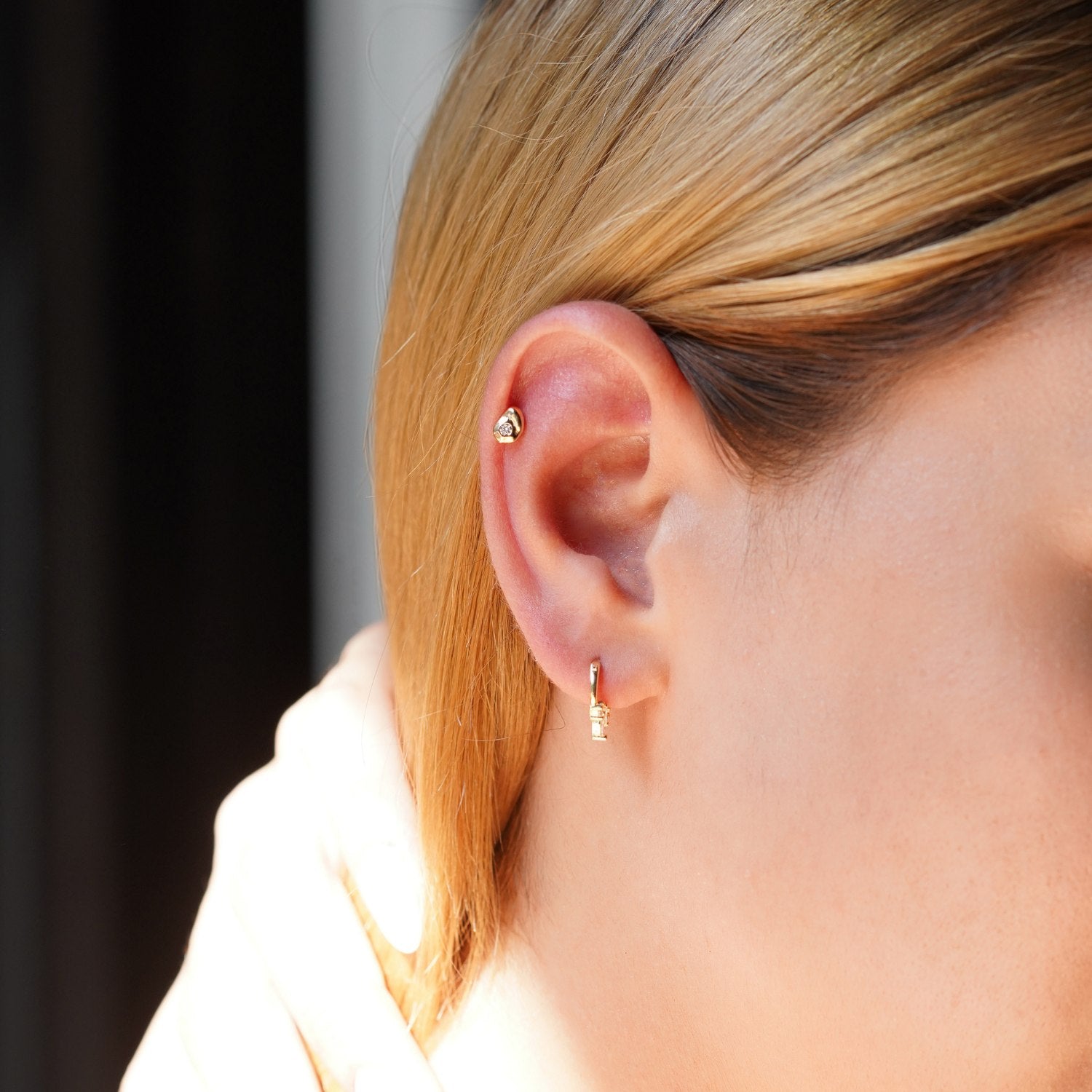 This Sterling Silver Helix Tragus Piercing - Gold by Spero London is a subtle yet elegant way to elevate your ear stack. Made from high-quality sterling silver, this piercing adds a touch of delicate shine and sophistication to your ear. It is the perfect accessory for those who appreciate understated luxury and a minimalist approach to personal style.