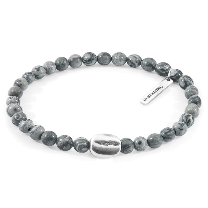 This Grey Jasper Gustatory Coffee Bean Silver & Stone Bracelet by Anchor & Crew is a modern and minimalist piece handcrafted in Great Britain. In collaboration with GUSTATORY, this bracelet features a solid .925 sterling silver coffee bean and logo tag paired with 6mm grey jasper stone beads. The elastic nylon thread allows for a comfortable fit. This bracelet combines British craftsmanship with a modern aesthetic, making it a unique and stylish accessory for the modern journeyman who appreciates the artistry and quality in every detail.