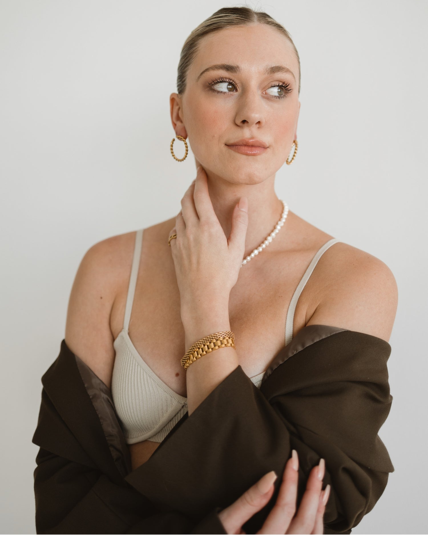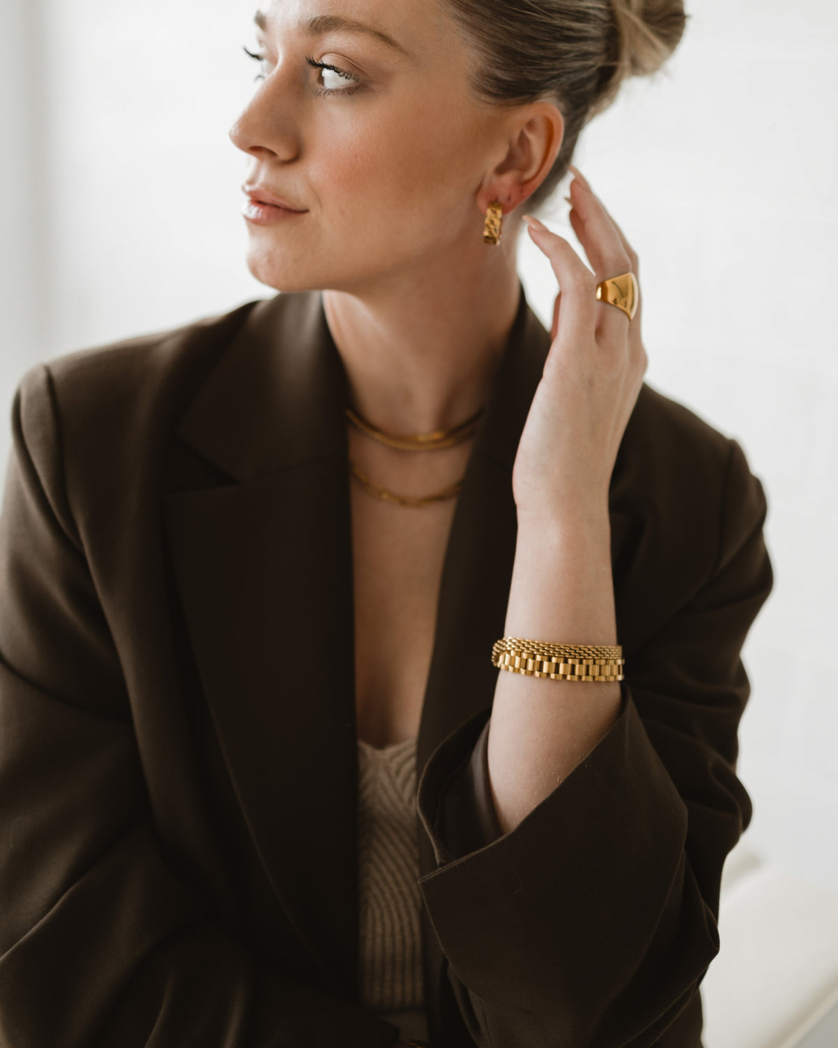 The Zain Watchband by Viea is a classic and innovative bracelet inspired by timeless watch links. It reintroduces the oyster watch strap into a classy bracelet with a dainty 10mm thickness. It features a folding clasp for a barely noticeable closure and is perfect for wearing alone or layering with other bracelets for added texture.
