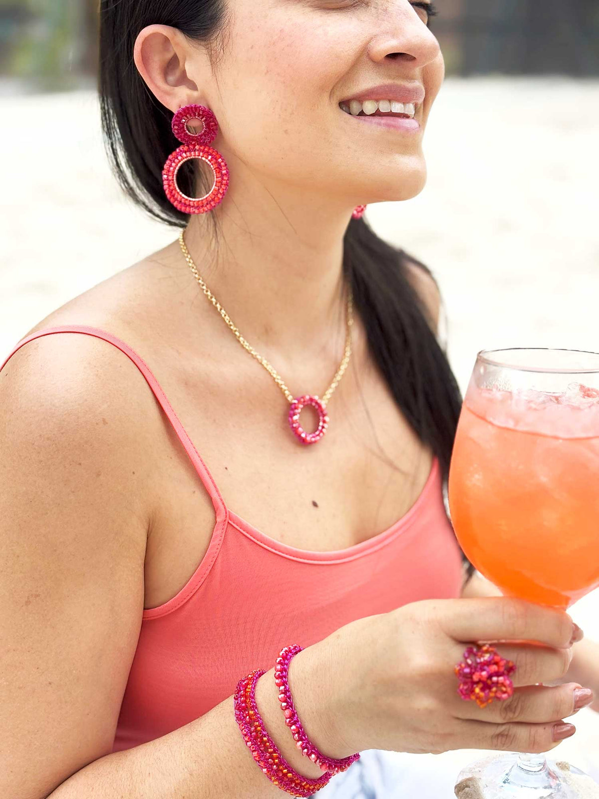 This Neon Fuchsia Mix Ziggy Handmade Crochet Bracelet by Lavish by Tricia Milaneze is a vibrant cuff designed to make a joyful statement. Handcrafted with enameled wire and sparkling crystals, its bold colours and intricate crochet design bring a playful sophistication to any look. Light and comfortable, the bracelet is finished with a magnetic clasp, adding both practicality and ease of wear. Every bracelet is one-of-a-kind, capturing the soul and artistry of its maker while celebrating colour, energy, and individuality.