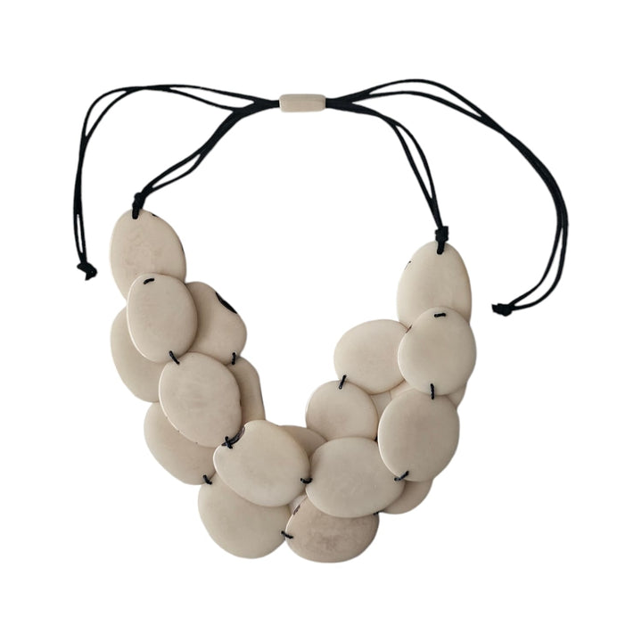This Tagua Necklace White by Shamuk is a unique and sustainable accessory. Made from Tagua, a natural seed known as "vegetable ivory," this necklace is handcrafted in artisanal workshops. The white tagua seeds are carved and polished, giving them a smooth and organic feel. This necklace is an elegant and versatile piece that is perfect for those who appreciate natural and eco-friendly materials.