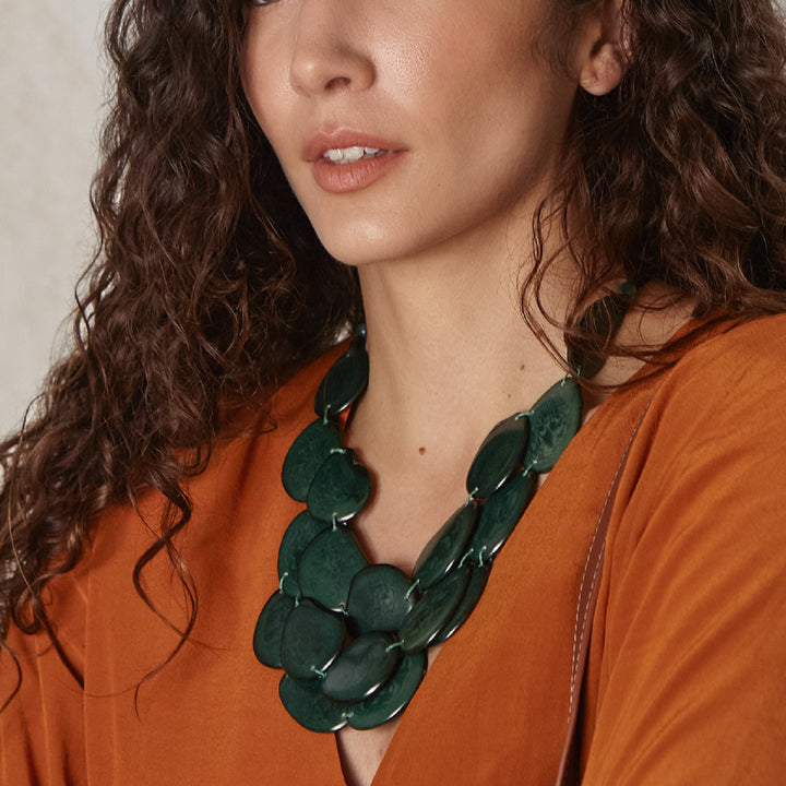 This Tagua Necklace Salmon Red And Grey by Shamuk is a beautiful and sustainable accessory, crafted from Tagua seeds known as "vegetable ivory." Each bead is carved and polished by Ecuadorian artisans, giving the piece a unique and natural texture. The harmonious blend of salmon red and grey hues creates a distinctive, earthy aesthetic that connects you to nature and celebrates traditional craftsmanship with every wear.