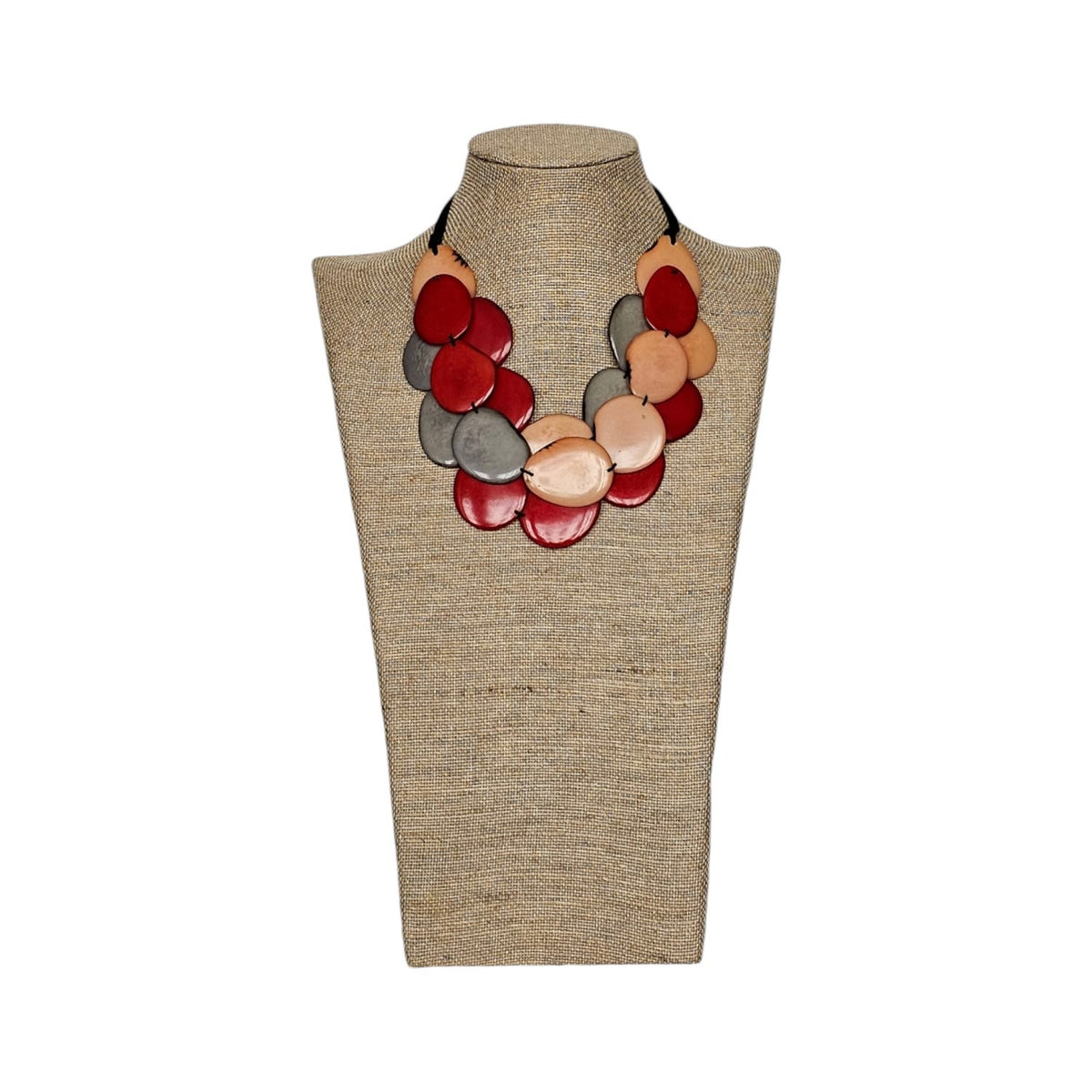 This necklace is made from natural Tagua seeds, which are carved and polished. The seeds are colored in salmon red and grey.
