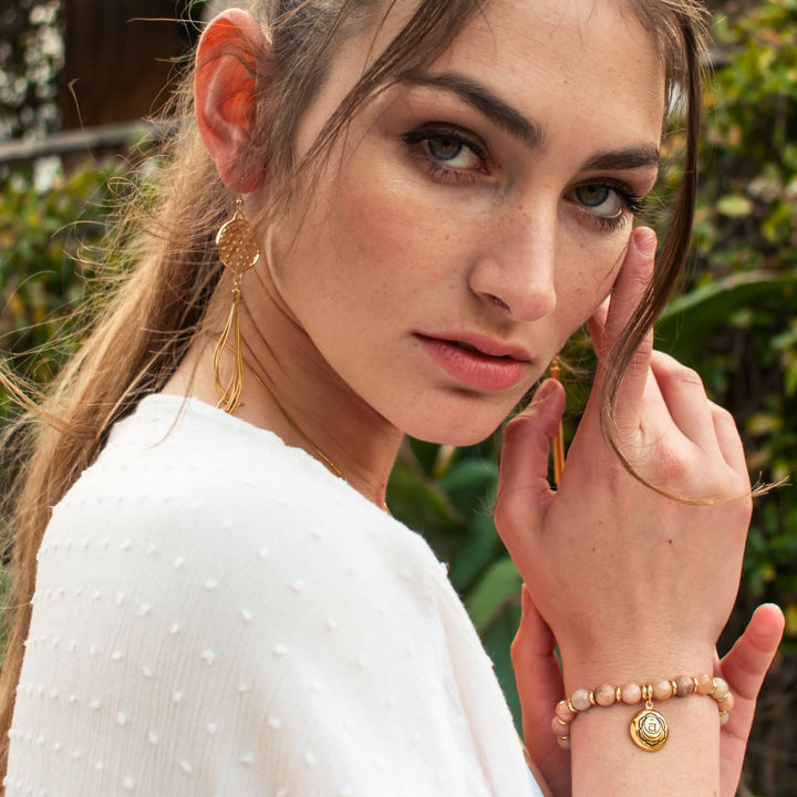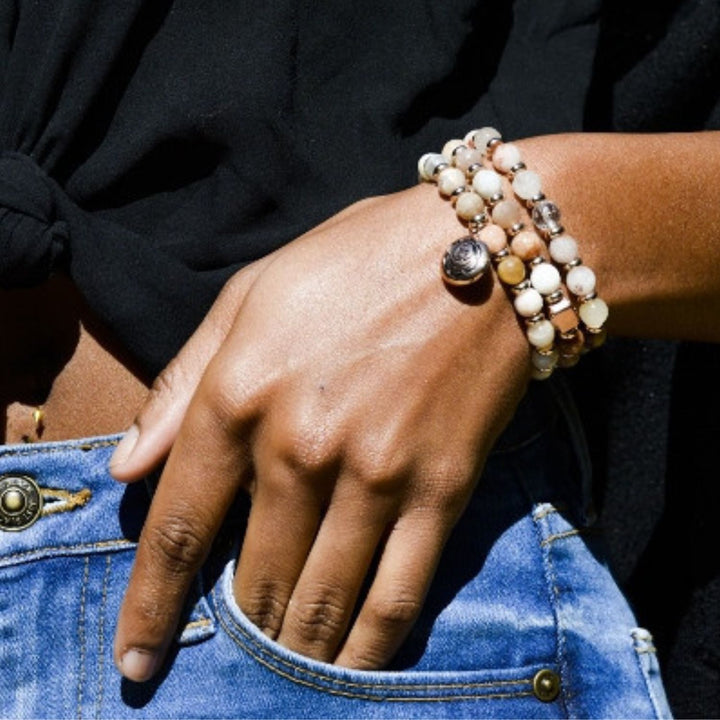 This stretch bracelet is made with 18K rose gold-plated brass and sunstone gemstones. It features an engraved Sacral chakra charm and a Seven Saints signature bead.
