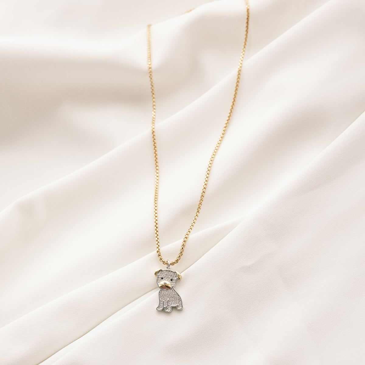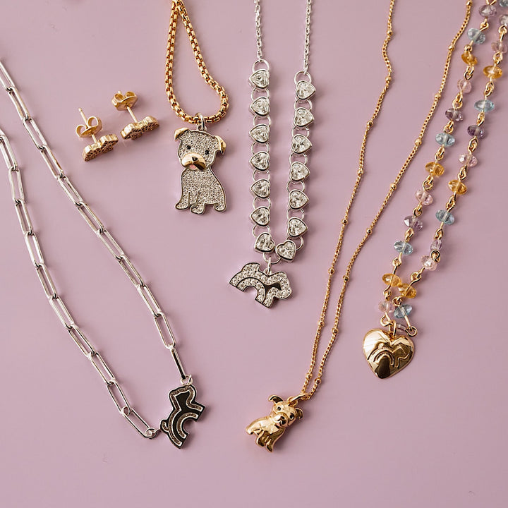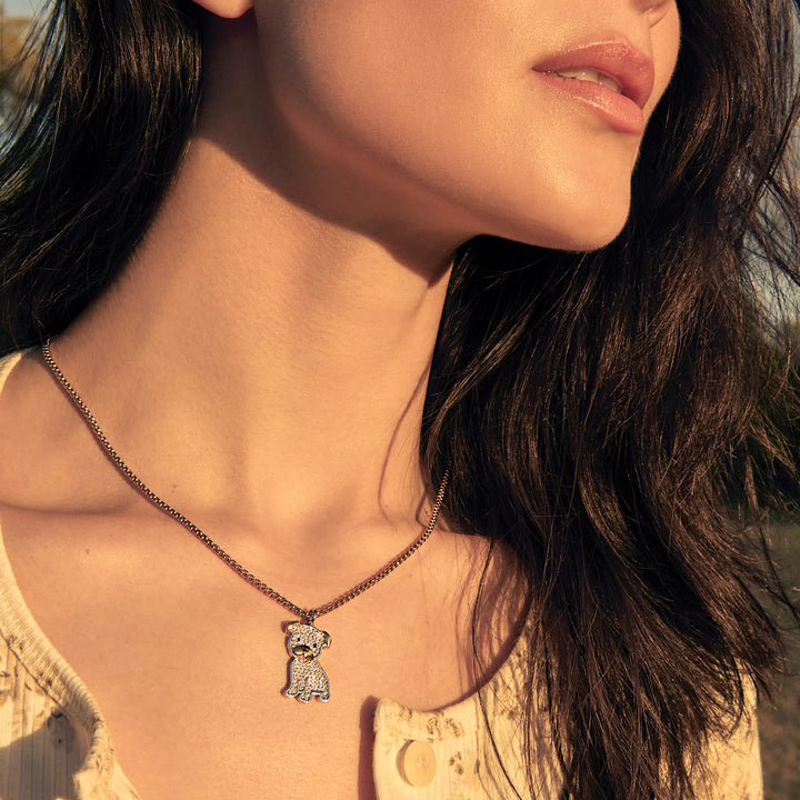This Cloud Haven Mini Cz Pit Bull Pendant Necklace by Cloud Haven is a beautifully crafted accessory for animal lovers. It features a custom Cz studded pit bull pendant dangling from a dainty chain. Made from high-quality 24k gold plated brass and finished with a lobster clasp and paw print tag, this necklace is both playful and elegant.
