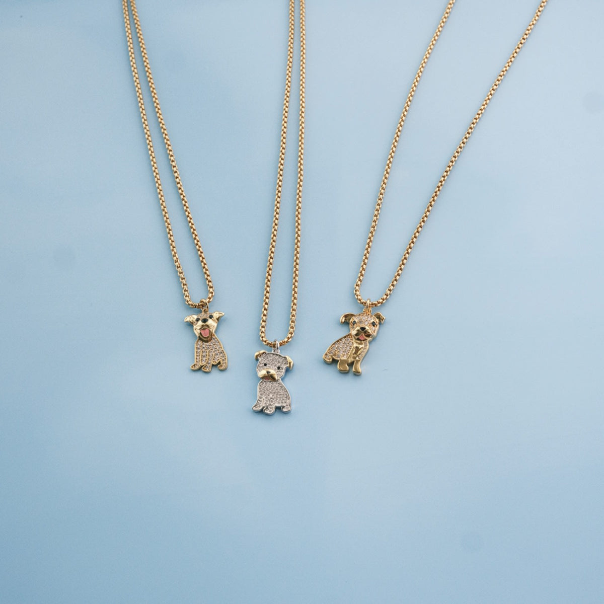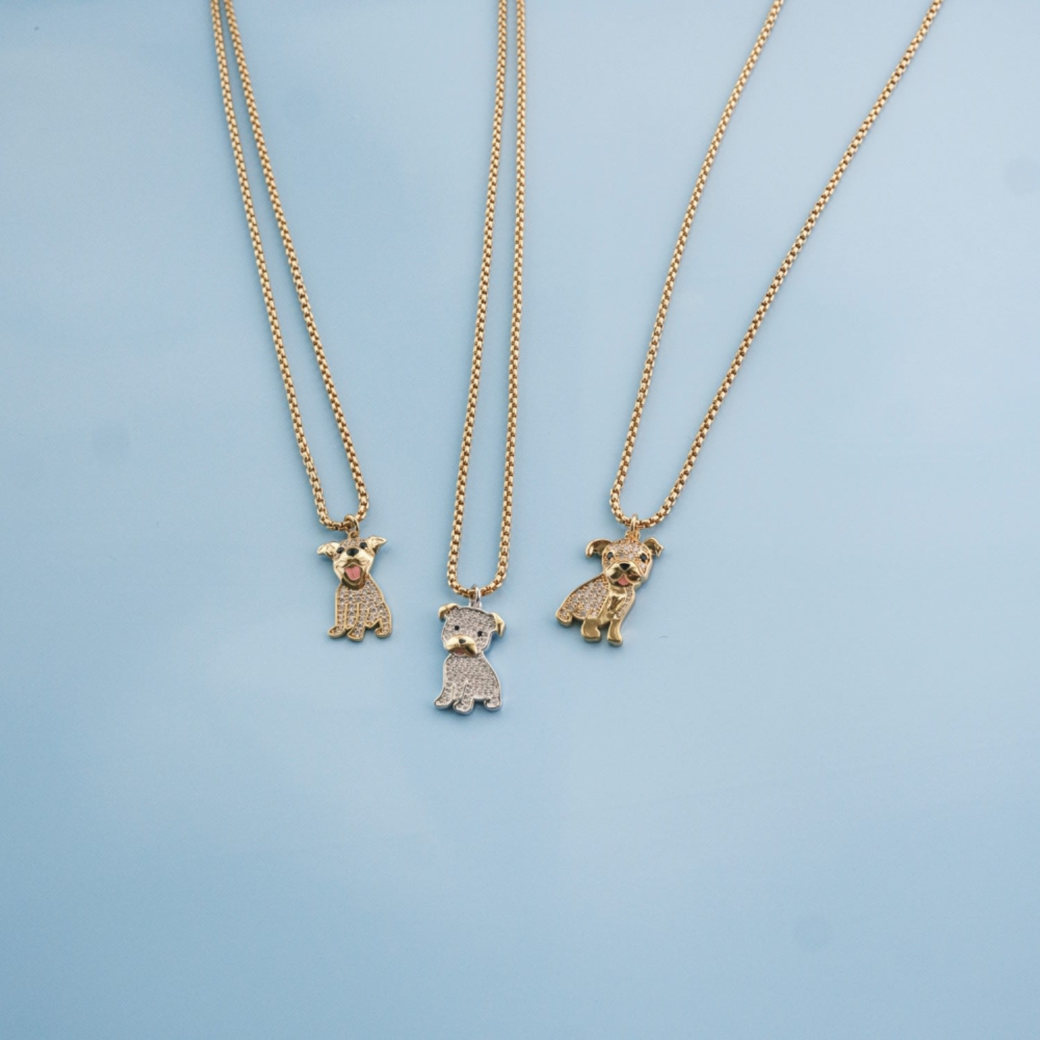 This necklace is made from high-quality 24k gold plated brass and features a custom cubic zirconia studded pit bull pendant. It has a lobster clasp.